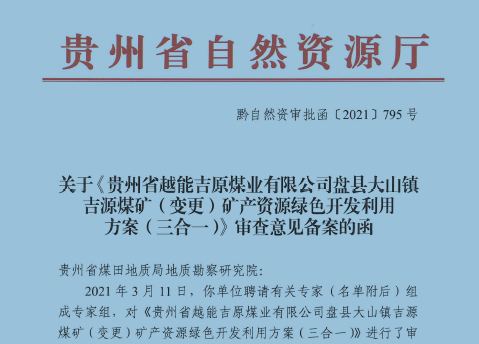 貴州省越能吉原煤業有限公司盤縣大山鎮吉源煤礦(變更)礦產資源綠色開發利用方案(三合一)