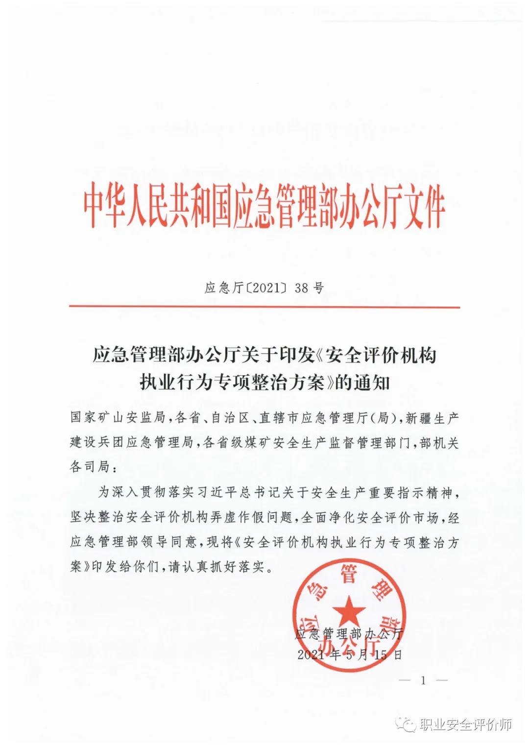 應急管理部辦公廳關于印發《安全評價機構執業行為專項整治方案》的通知
