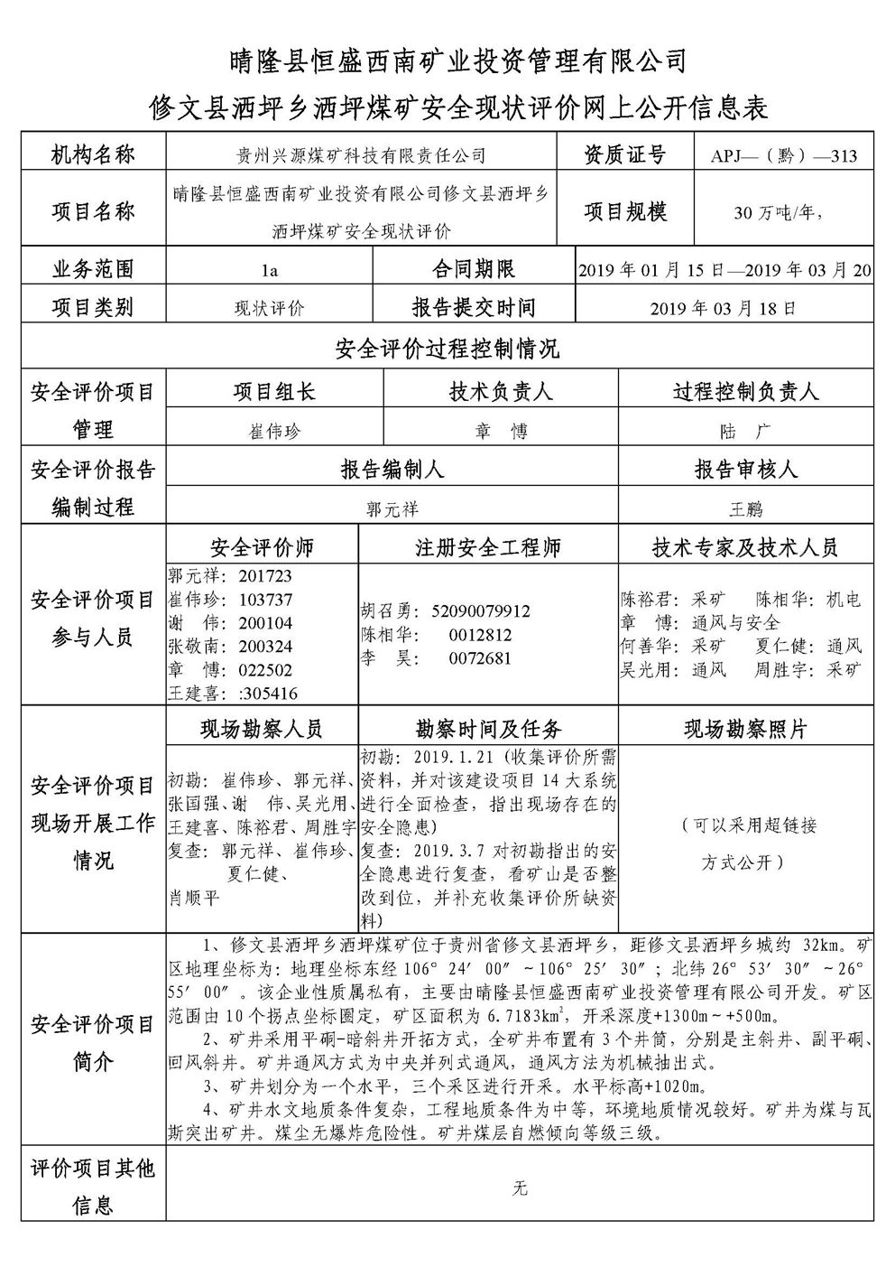 晴隆縣恒盛西南礦業投資管理有限公司修文縣灑坪鄉灑坪煤礦安全現狀評價網上公開信息表