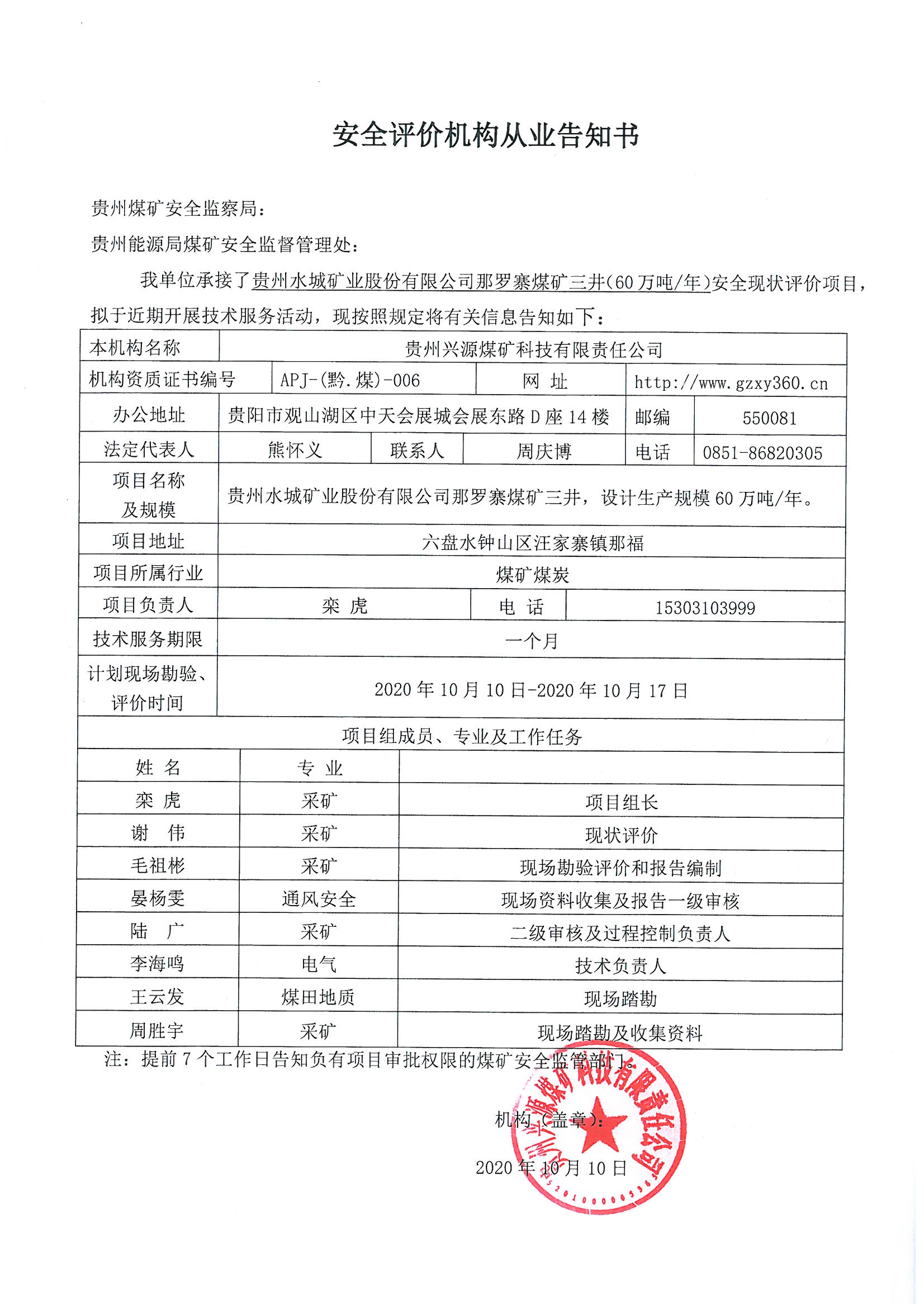 安全評價(jià)機(jī)構(gòu)從業(yè)告知書(貴州水城礦業(yè)股份有限公司那羅寨煤礦三井)