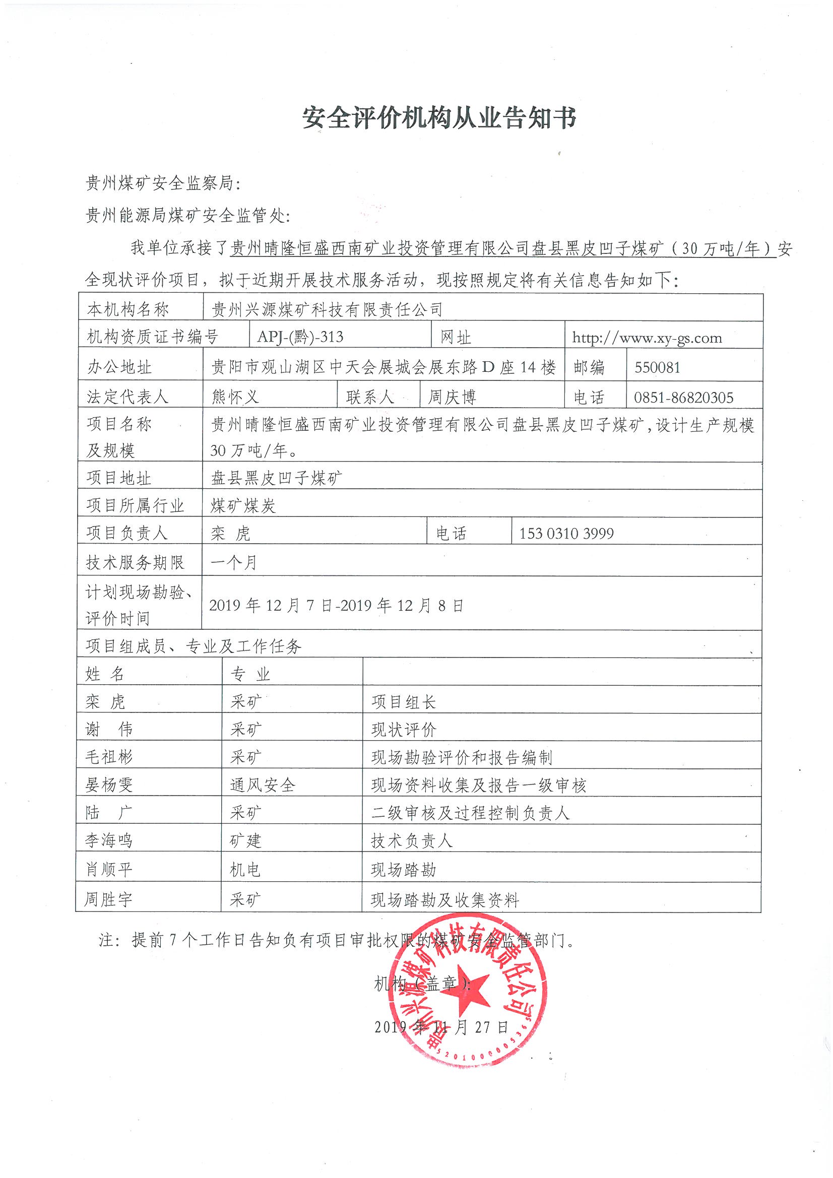 安全評價機構從業告知書[貴州晴隆恒盛西南礦業投資管理有限公司盤縣黑皮凹子煤礦(30萬噸/年)安全現狀評價]