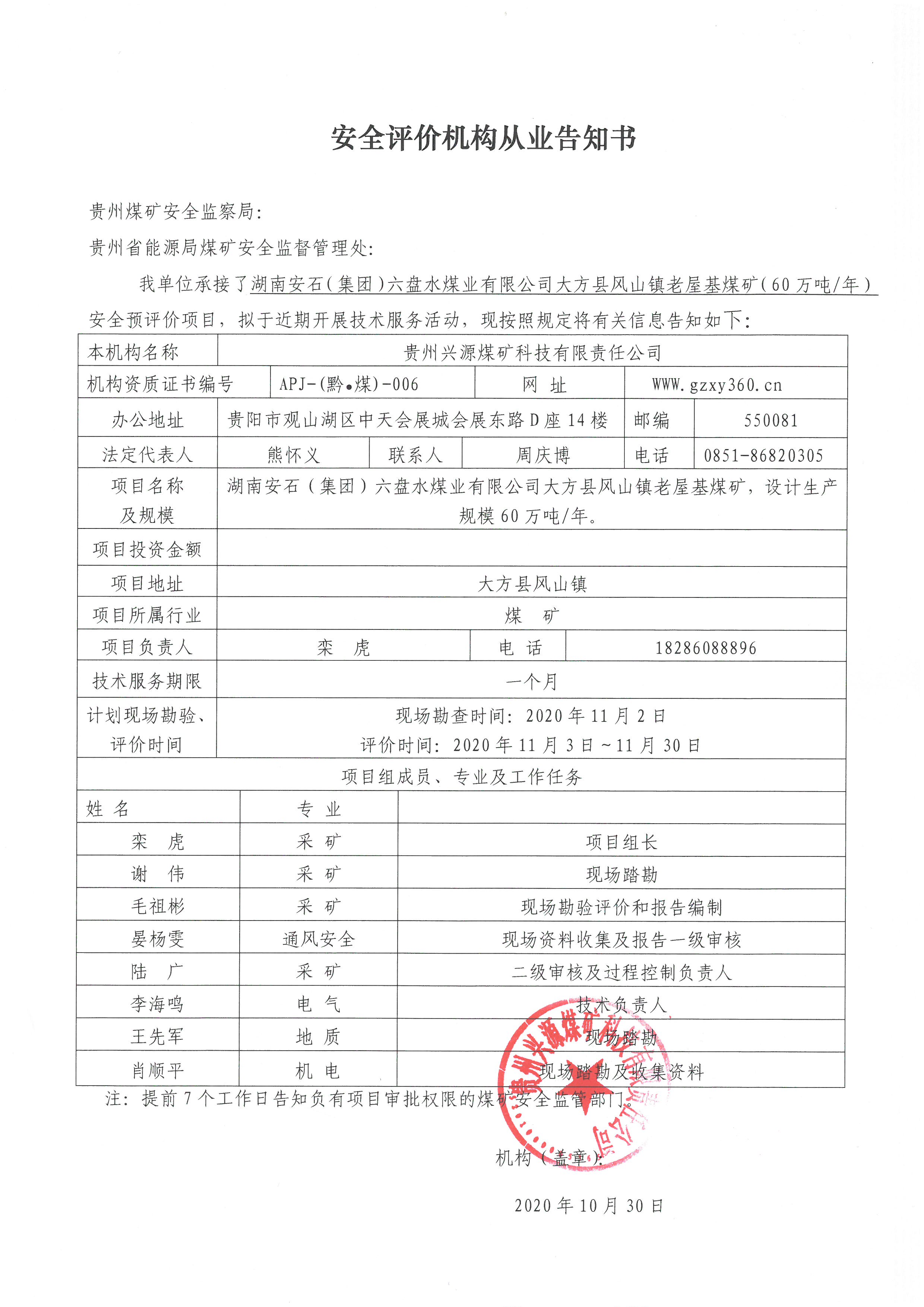 安全評(píng)價(jià)機(jī)構(gòu)從業(yè)告知書【湖南安石(集團(tuán))六盤水煤業(yè)有限公司大方縣風(fēng)山鎮(zhèn)老屋基煤礦】