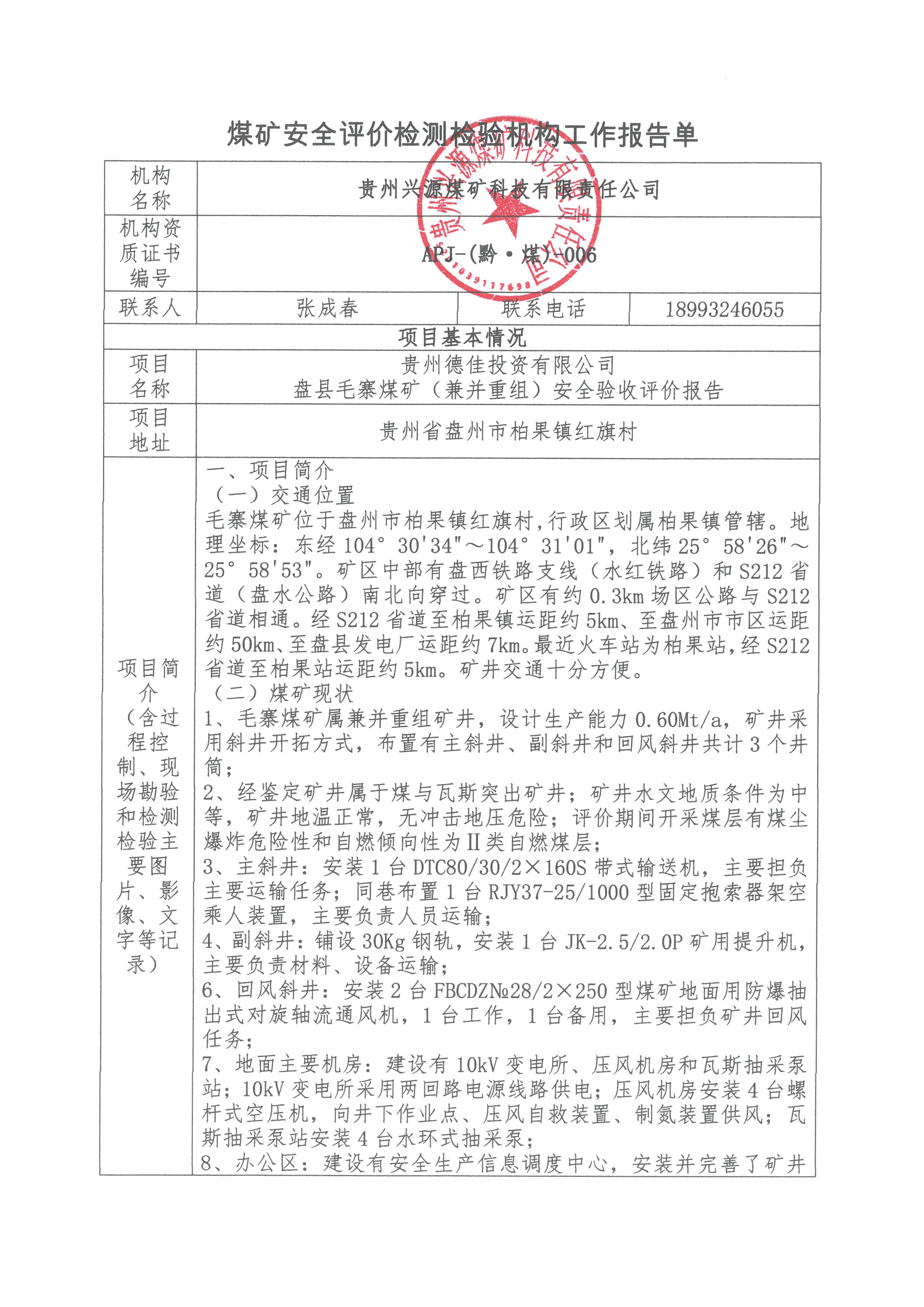 煤礦安全評(píng)價(jià)檢測檢驗(yàn)機(jī)構(gòu)工作報(bào)告單【貴州德佳投資有限公司盤縣毛寨煤礦(兼并重組)安全驗(yàn)收評(píng)價(jià)報(bào)告】