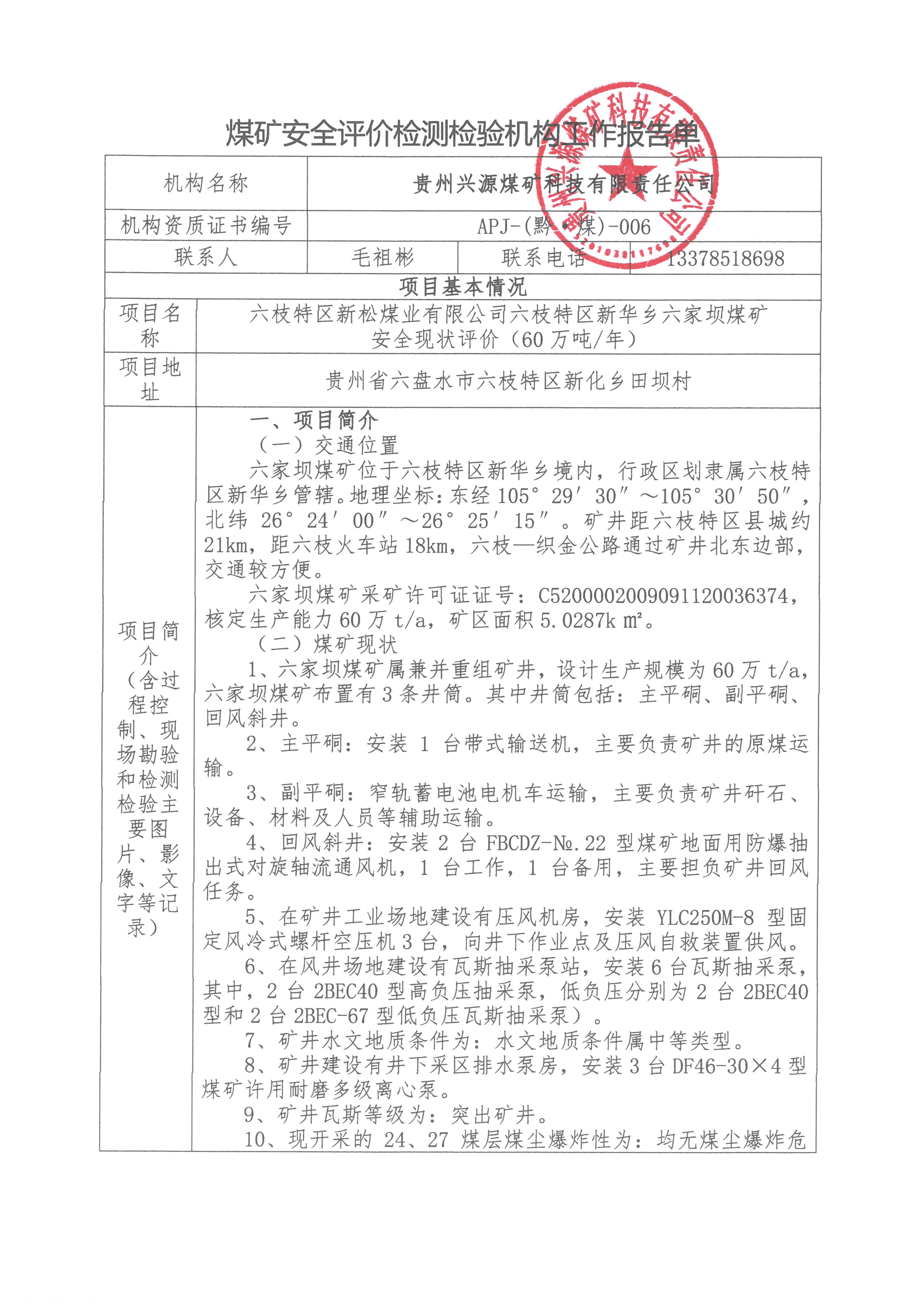 煤礦安全評價檢測檢驗機構工作報告單【六枝特區新松煤業有限公司六枝特區新華鄉六家壩煤礦安全現狀評價】