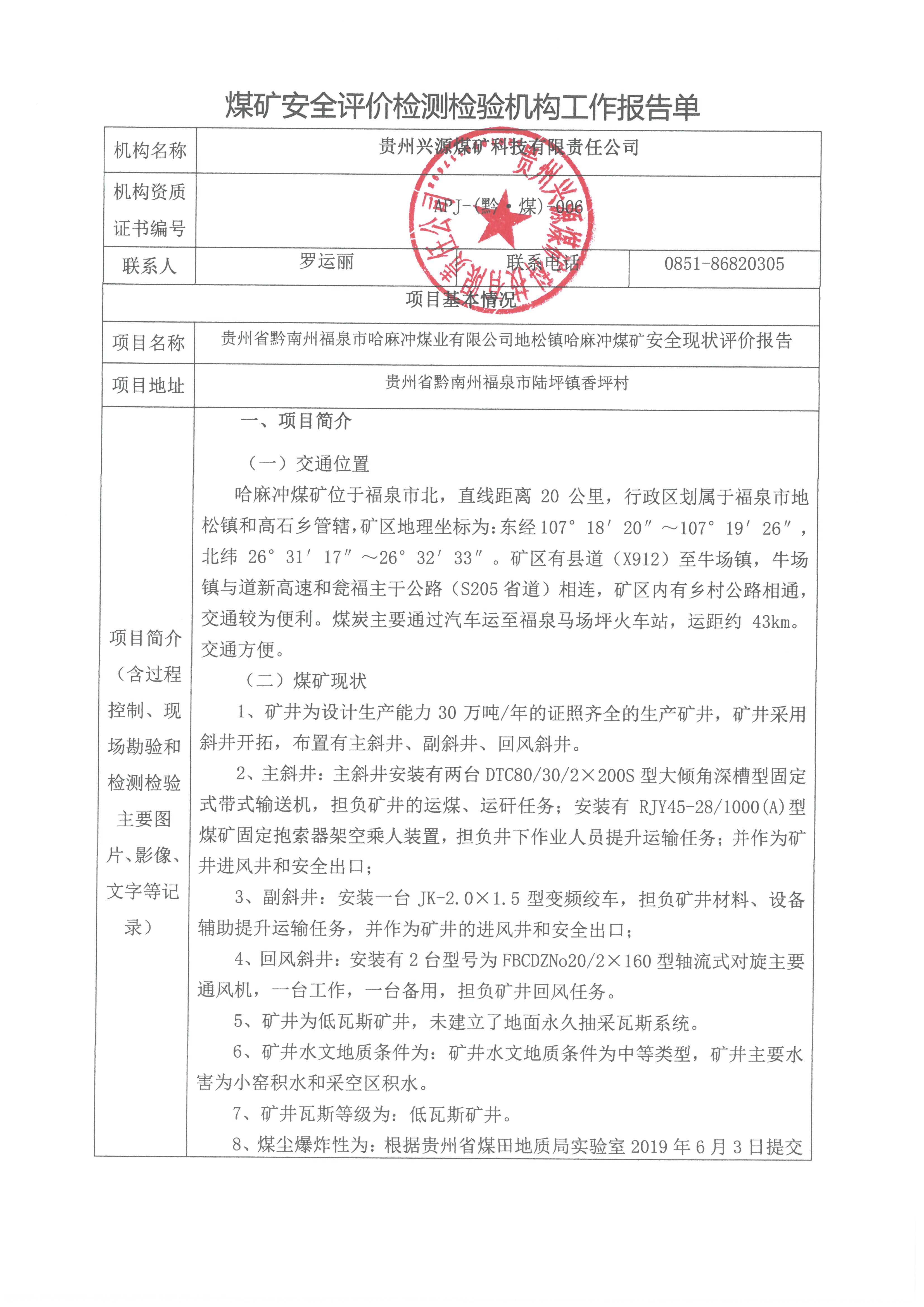煤礦安全評價檢測檢驗機構工作報告單【貴州省黔南州福泉市哈麻沖煤業有限公司地松鎮哈麻沖煤礦安全現狀評價報告】