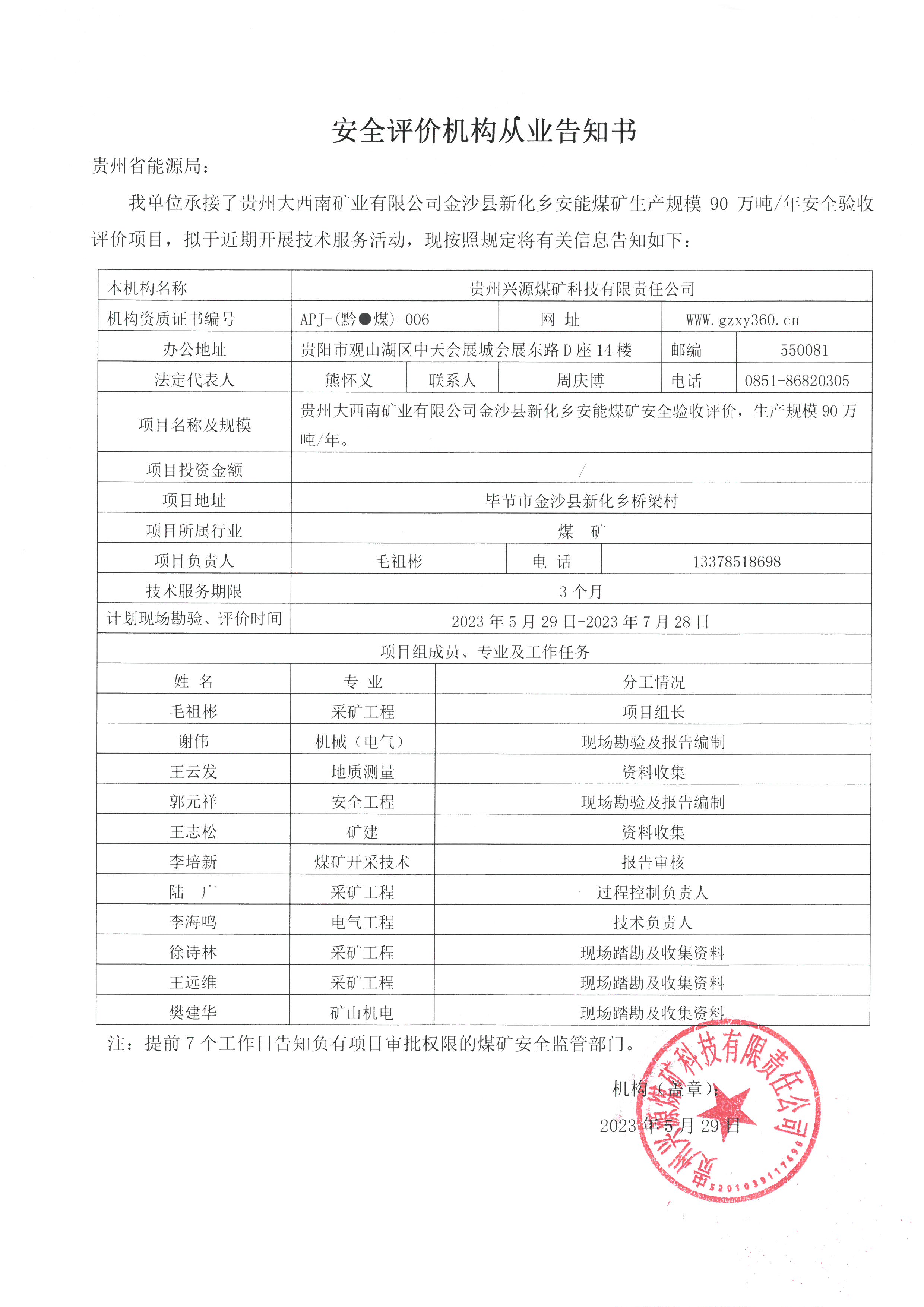 安全評(píng)價(jià)機(jī)構(gòu)從業(yè)告知書(shū)【貴州大西南礦業(yè)有限公司金沙縣新化鄉(xiāng)安能煤礦】