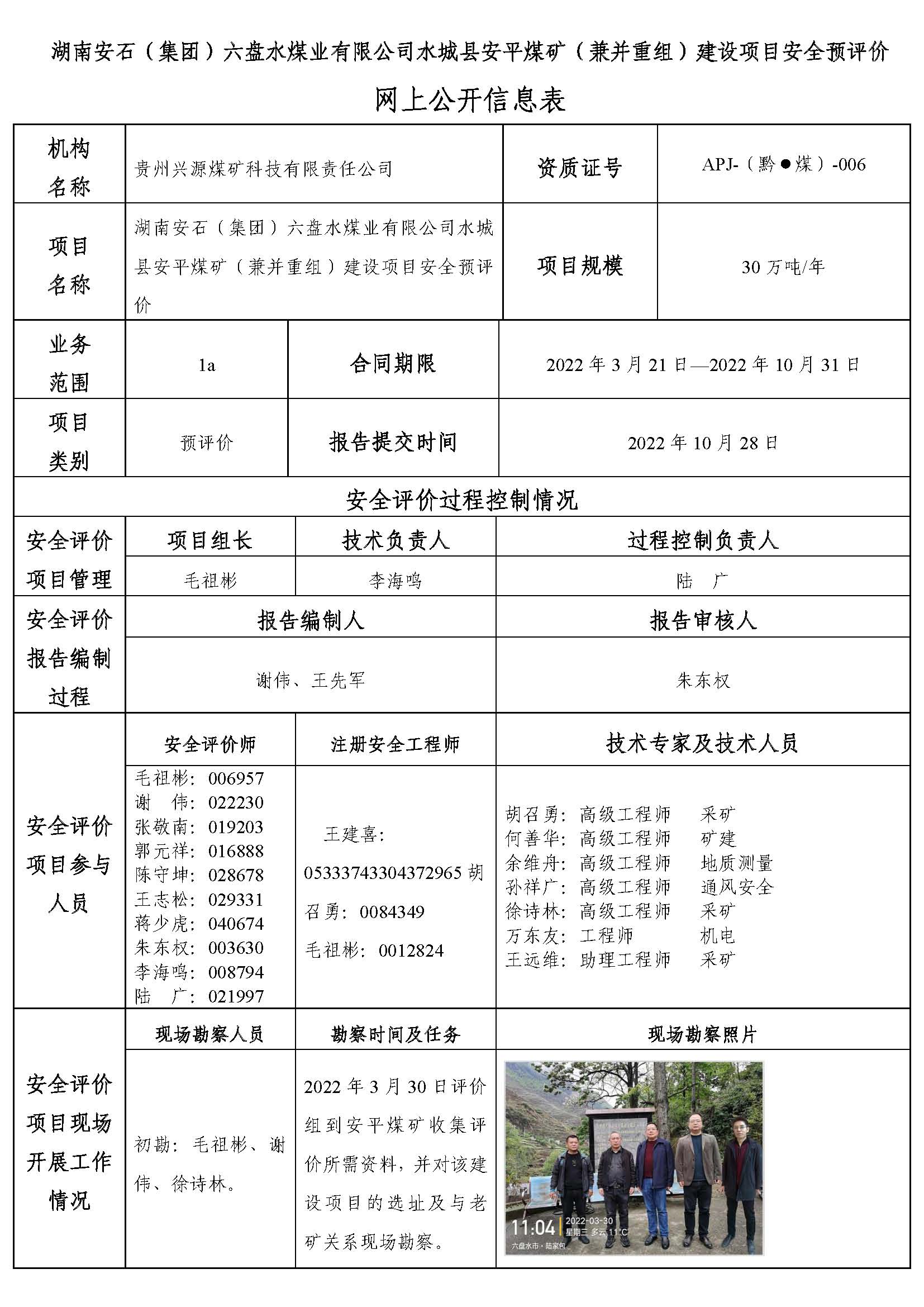 湖南安石(集團)六盤水煤業有限公司水城縣安平煤礦(兼并重組)建設項目安全預評價
