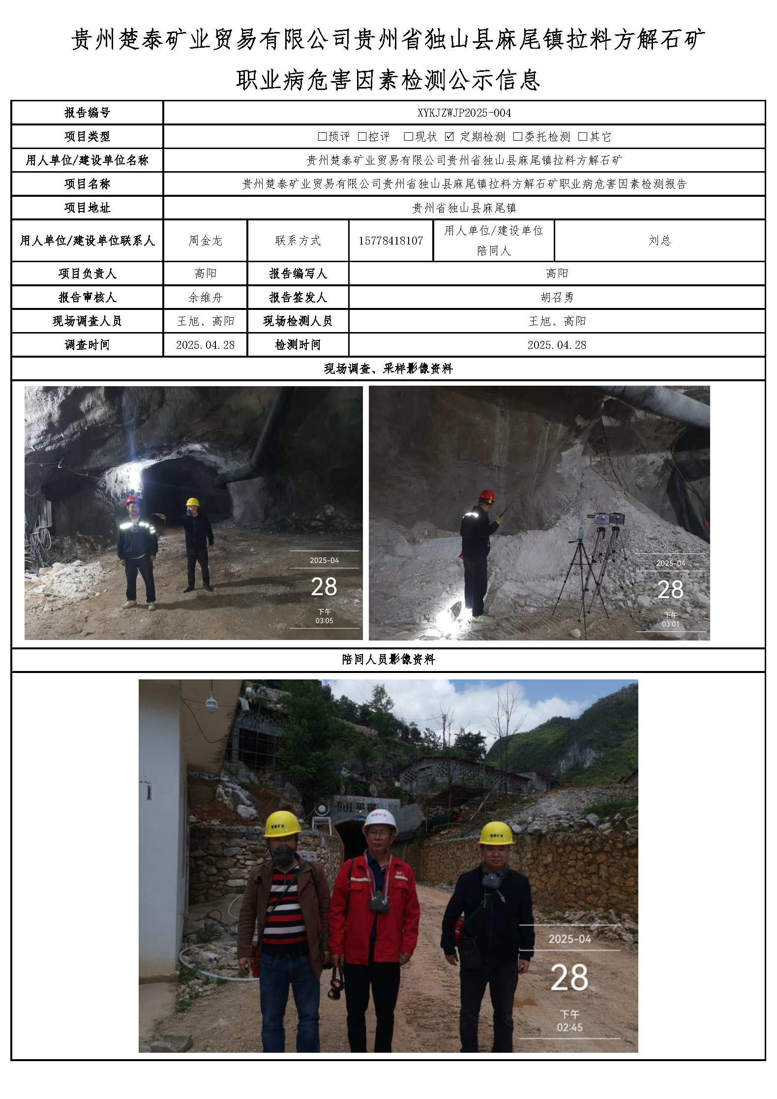 貴州楚泰礦業貿易有限公司貴州省獨山縣麻尾鎮拉料方解石礦職業病危害因素檢測公示信息