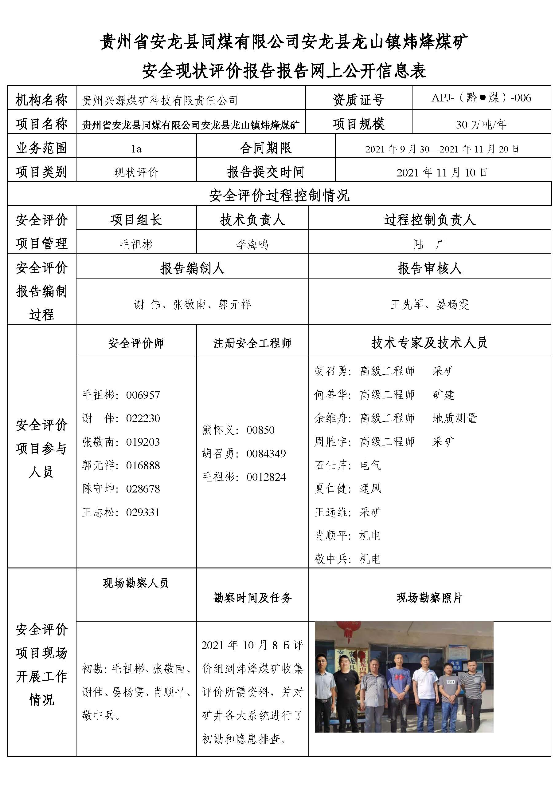 貴州省安龍縣同煤有限公司安龍縣龍山鎮煒烽煤礦 安全現狀評價報告報告網上公開信息表