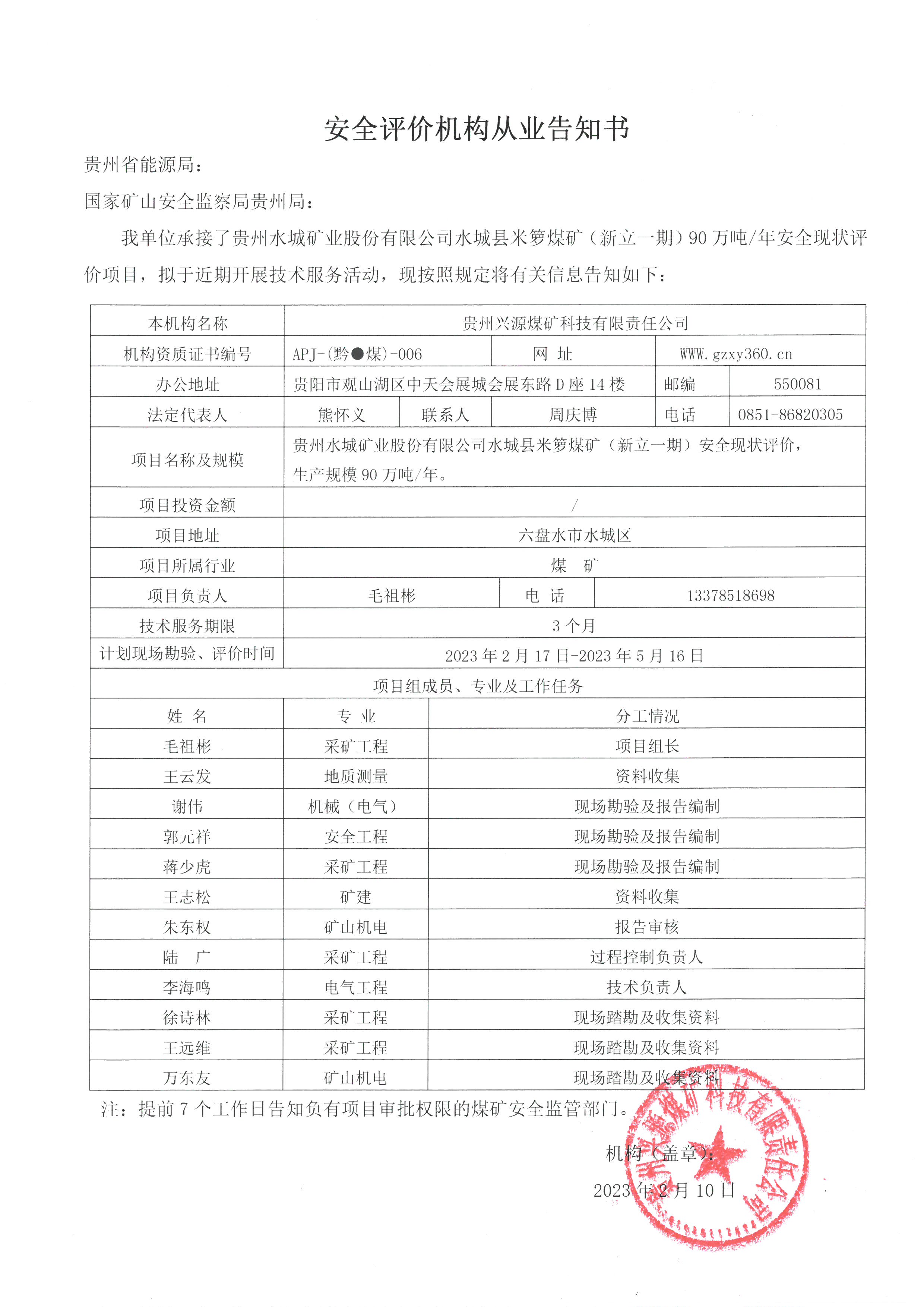 煤礦安全評價機構從業告知書(貴州水城礦業股份有限公司水城縣米籮煤礦(新立一期))
