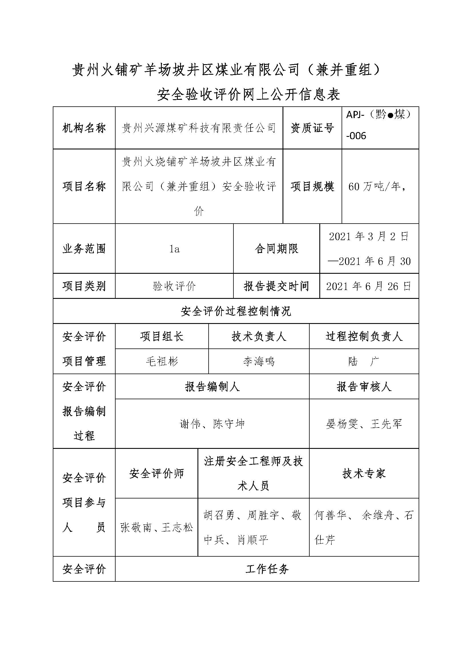 貴州火鋪礦羊場坡井區煤業有限公司(兼并重組)安全驗收評價網上公開信息表