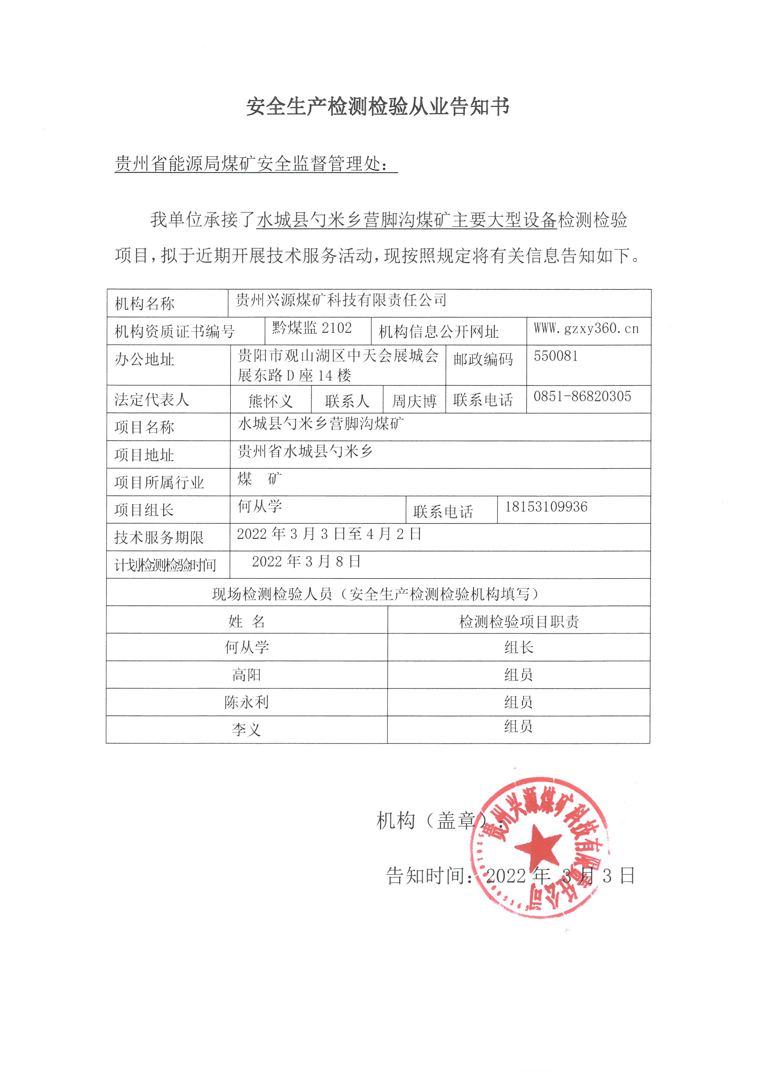 安全生產檢測檢驗從業告知書 【水城縣勺米鄉營腳溝煤礦主要大型設備檢測檢驗項目】