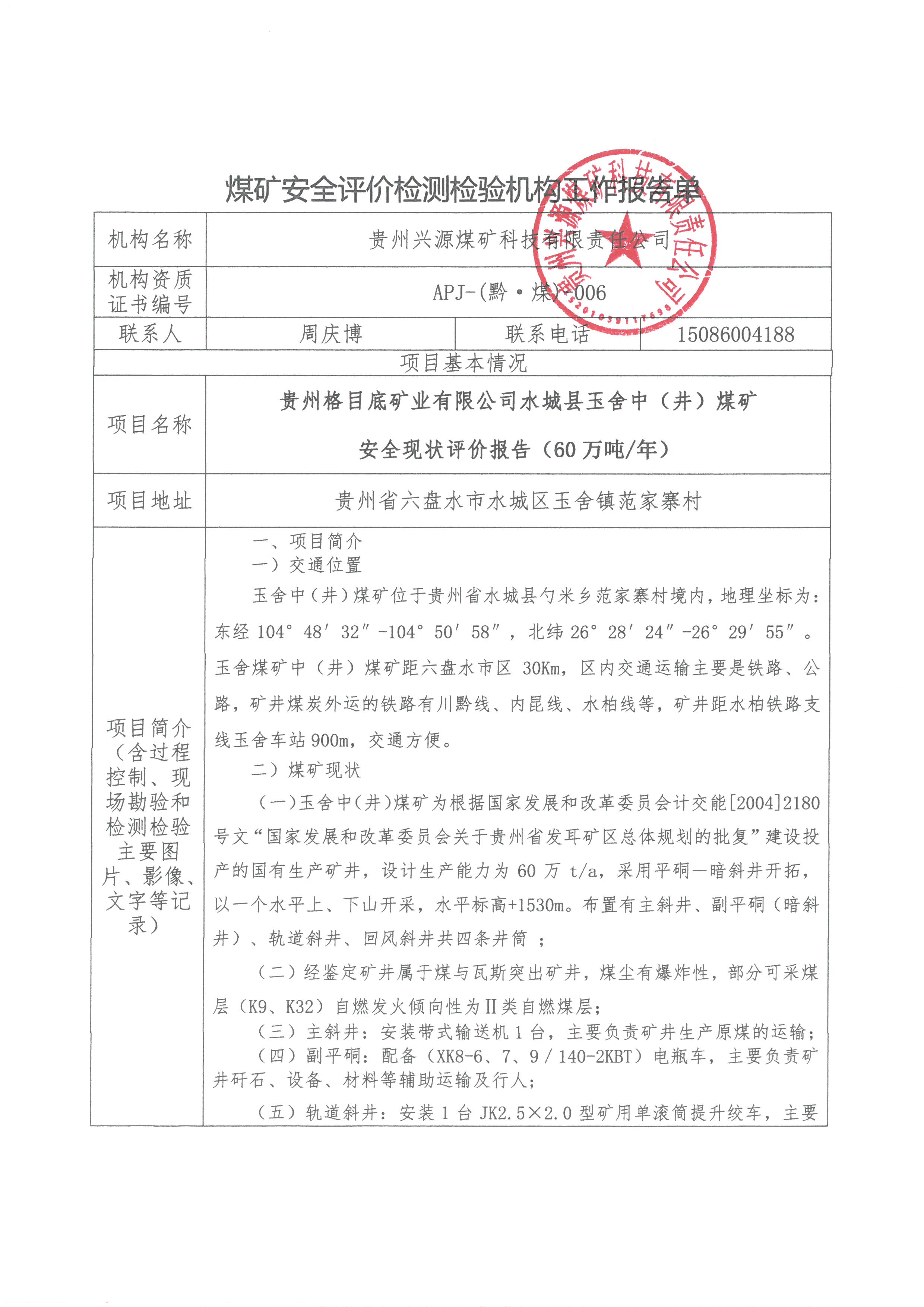 煤礦安全評價檢測檢驗機構工作報告單【貴州格目底礦業有限公司水城縣玉舍中(井)煤礦 安全現狀評價報告(60萬噸/年)】