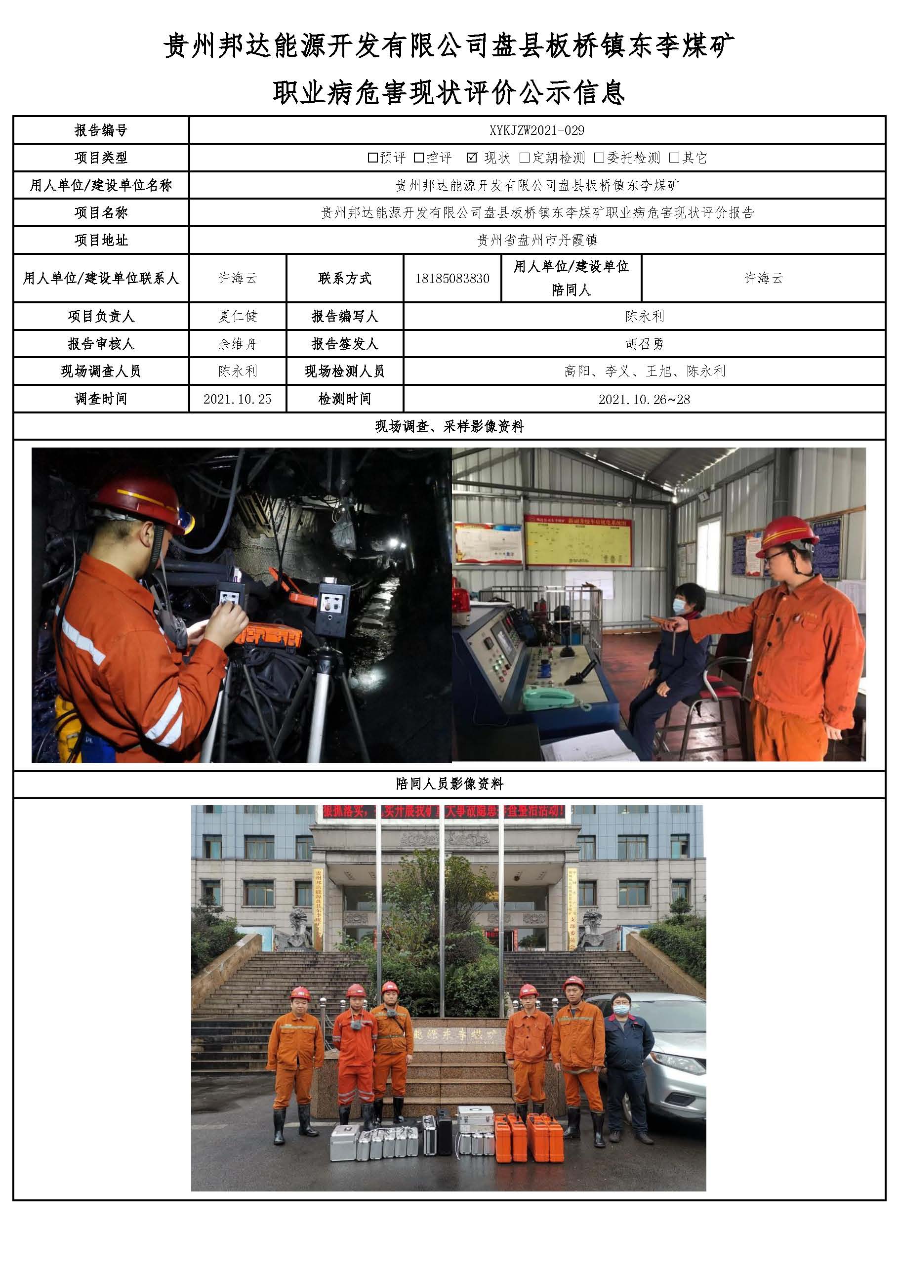 貴州邦達能源開發有限公司盤縣板橋鎮東李煤礦 職業病危害現狀評價公示信息