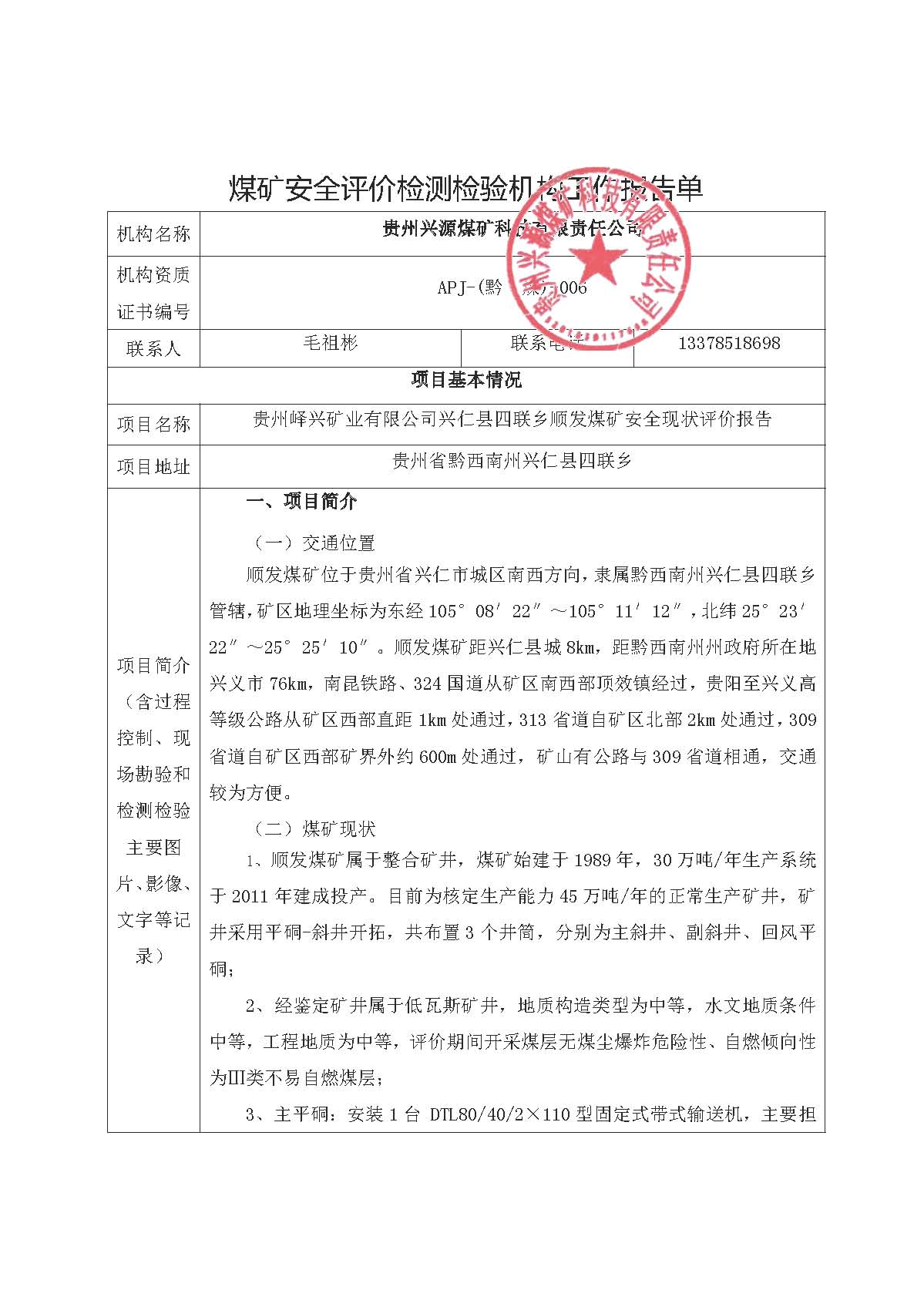 煤礦安全評價檢測檢驗機構工作報告單【貴州嶧興礦業有限公司興仁縣四聯鄉順發煤礦安全現狀評價報告】