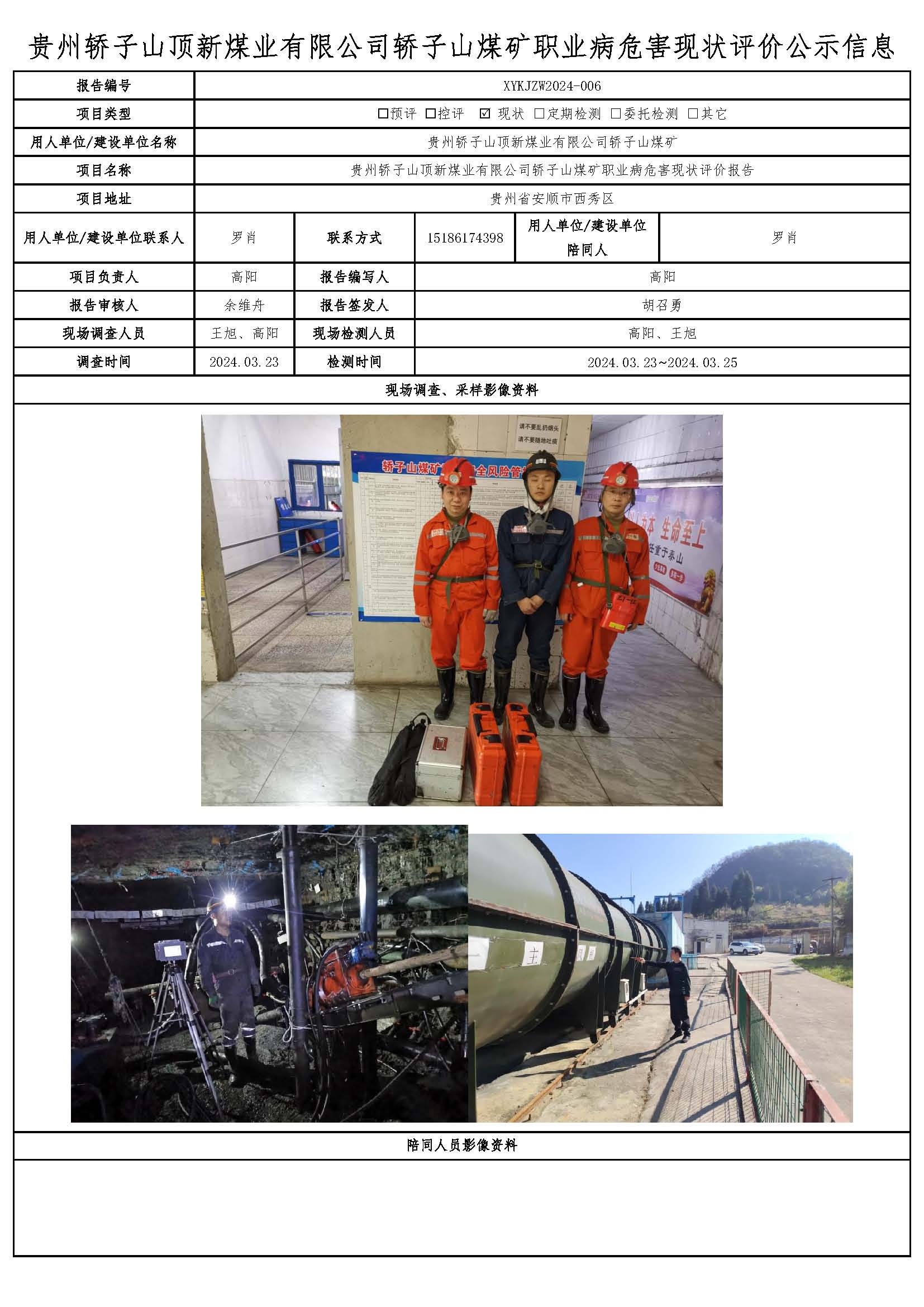 貴州轎子山頂新煤業有限公司轎子山煤礦職業病危害現狀評價公示信息