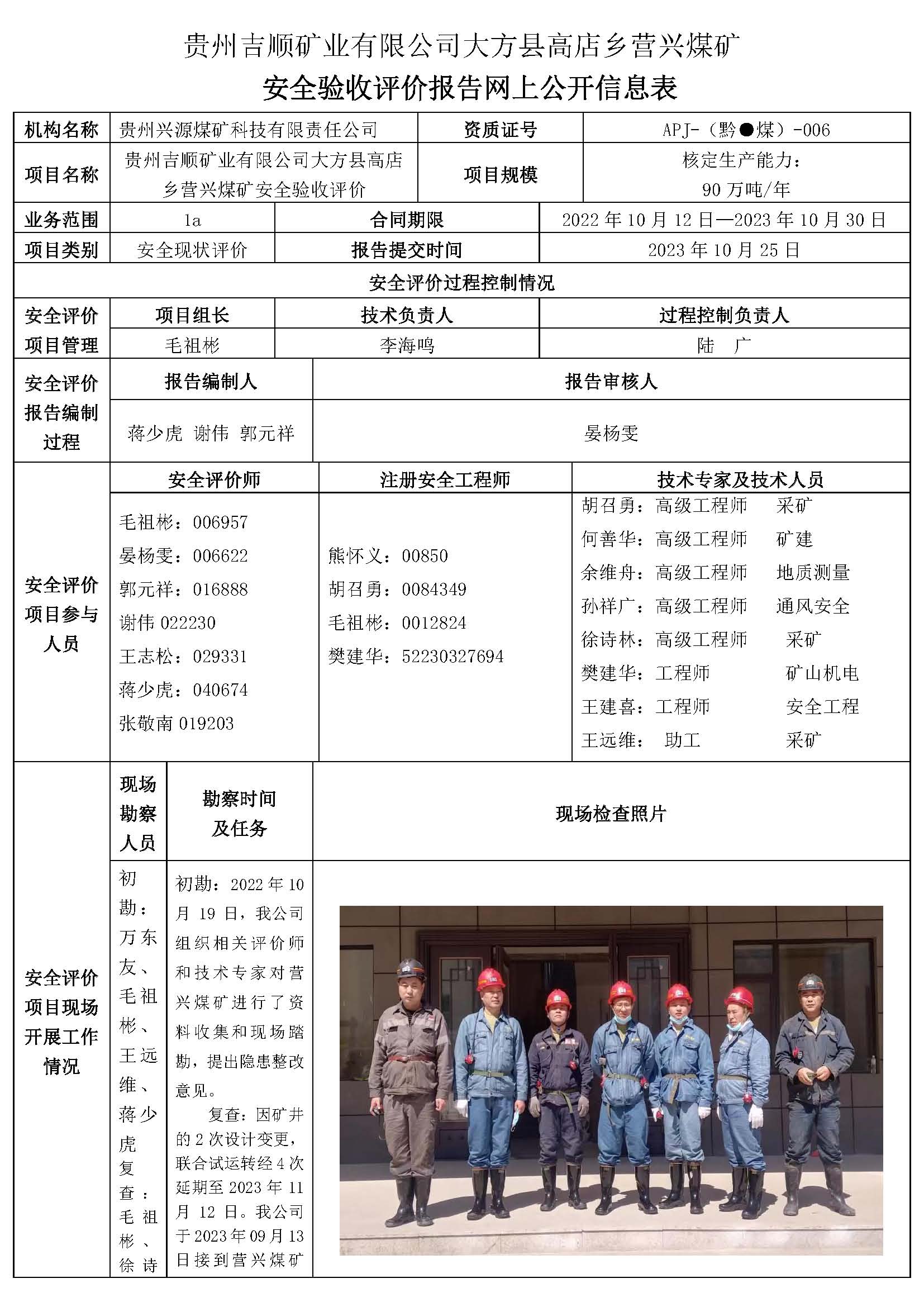 貴州吉順礦業(yè)有限公司大方縣高店鄉(xiāng)營興煤礦安全驗(yàn)收評價(jià)報(bào)告網(wǎng)上公開信息表