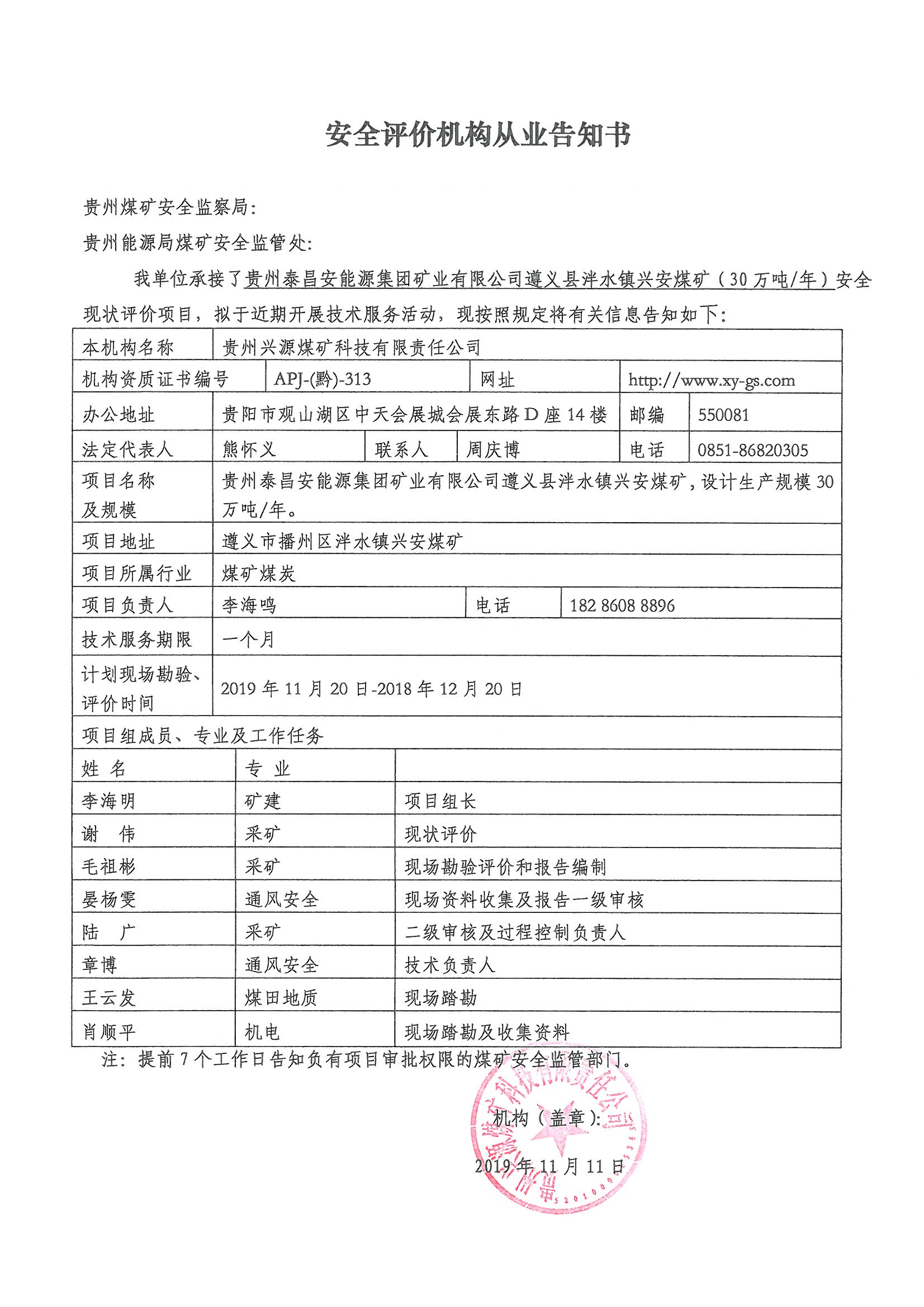 安全評價機構從業告知書[貴州泰昌安能源集團礦業有限公司遵義縣泮水鎮興安煤礦(30萬噸/年)安全現狀評價]