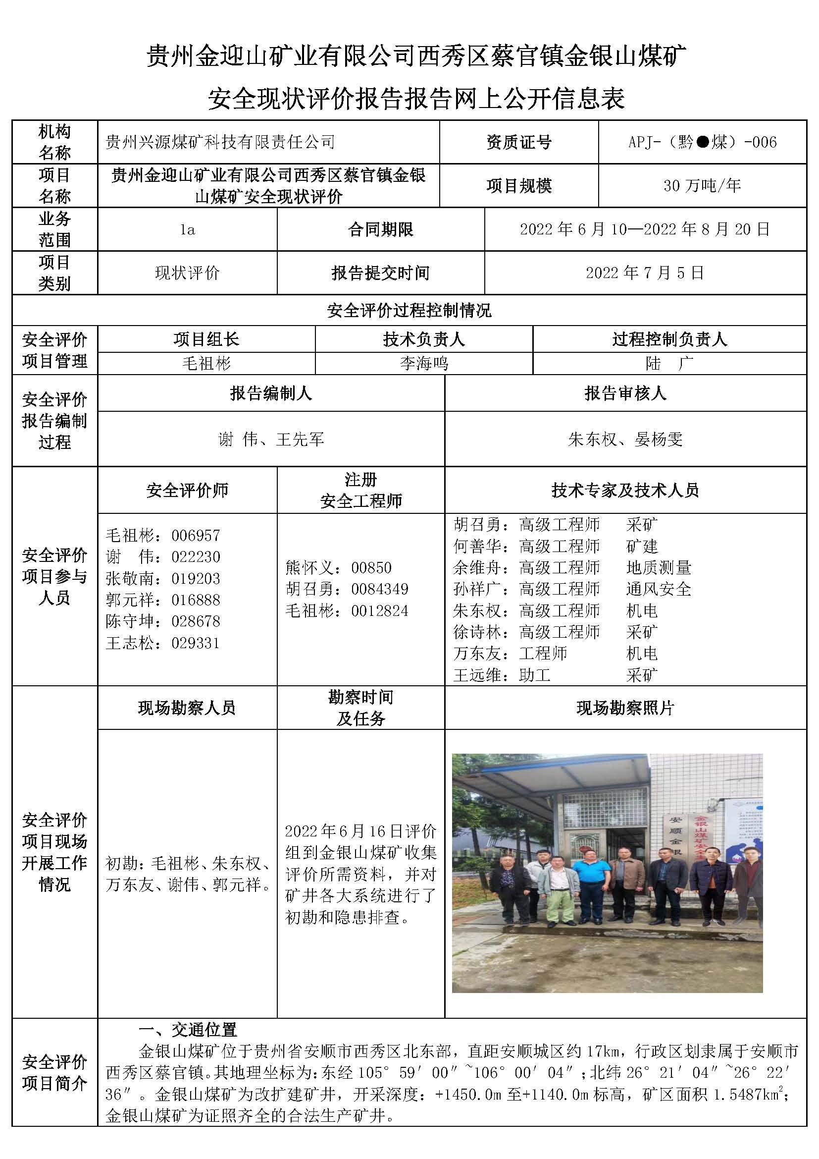 貴州金迎山礦業有限公司西秀區蔡官鎮金銀山煤礦安全現狀評價報告報告網上公開信息表