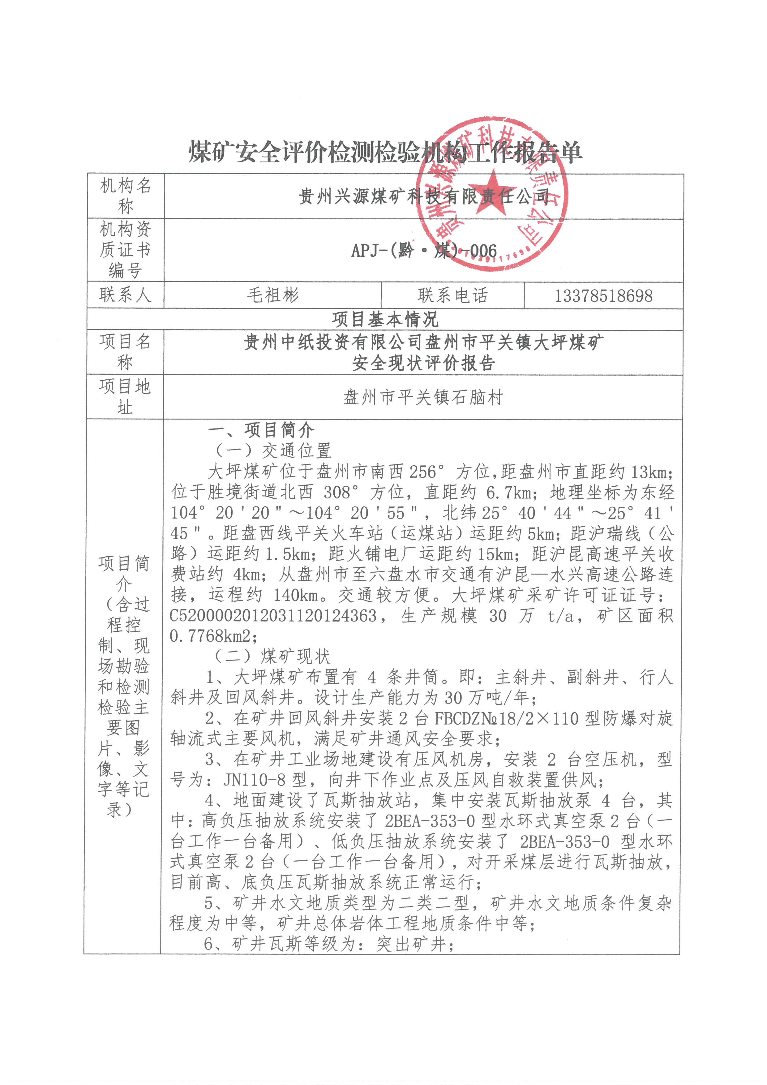 煤礦安全評價檢測檢驗機構工作報告單【貴州中紙投資有限公司 盤州市平關鎮大坪煤礦 安全現狀評價報告】