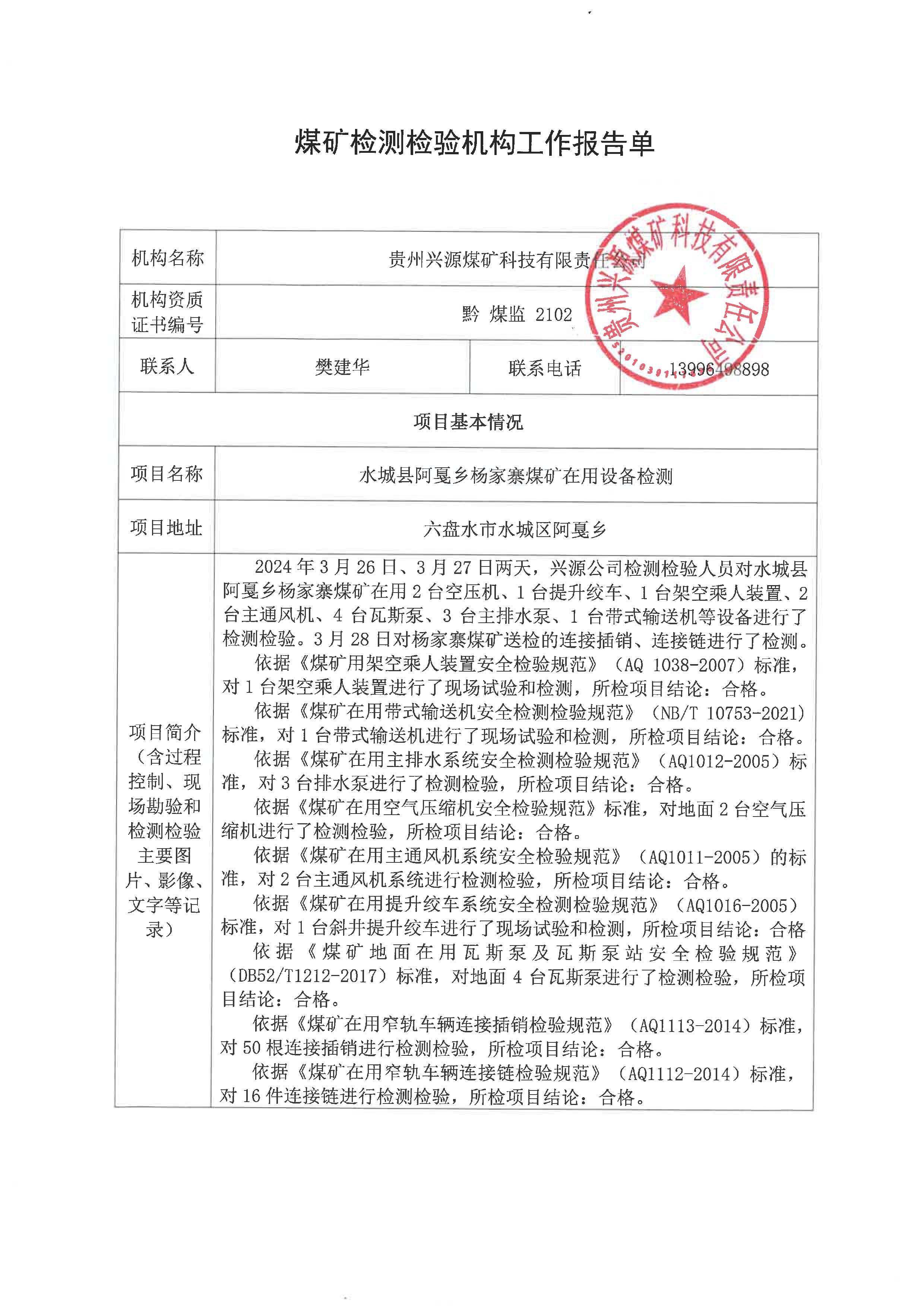 煤礦檢測檢驗機構工作報告單【水城縣阿戛鄉楊家寨煤礦在用設備檢測】