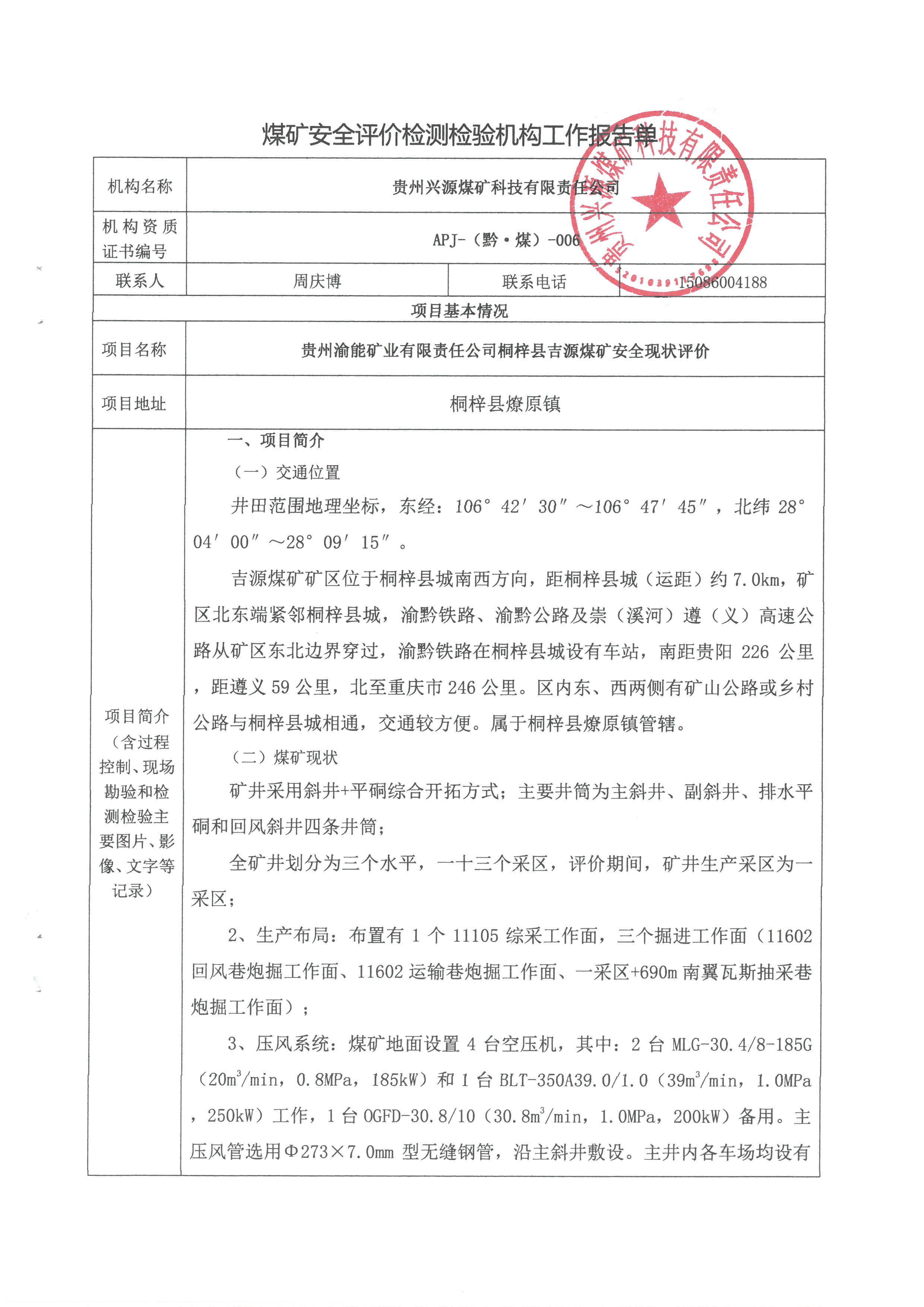 煤礦安全評(píng)價(jià)檢測(cè)檢驗(yàn)機(jī)構(gòu)工作報(bào)告單【貴州渝能礦業(yè)有限責(zé)任公司桐梓縣吉源煤礦安全現(xiàn)狀評(píng)價(jià)】