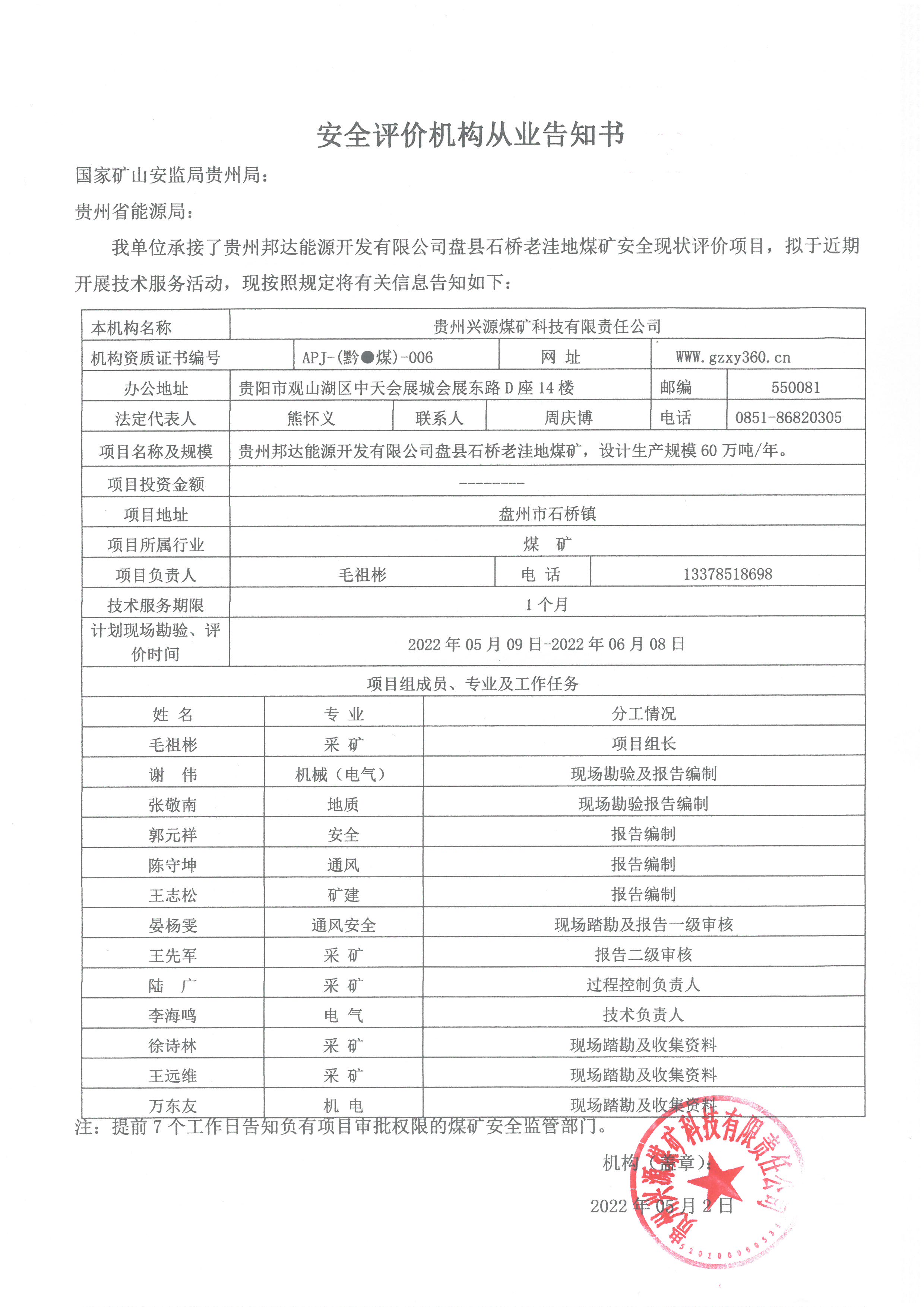 安全評(píng)價(jià)機(jī)構(gòu)從業(yè)告知書(shū)(貴州邦達(dá)能源開(kāi)發(fā)有限公司盤(pán)縣石橋老洼地煤礦)