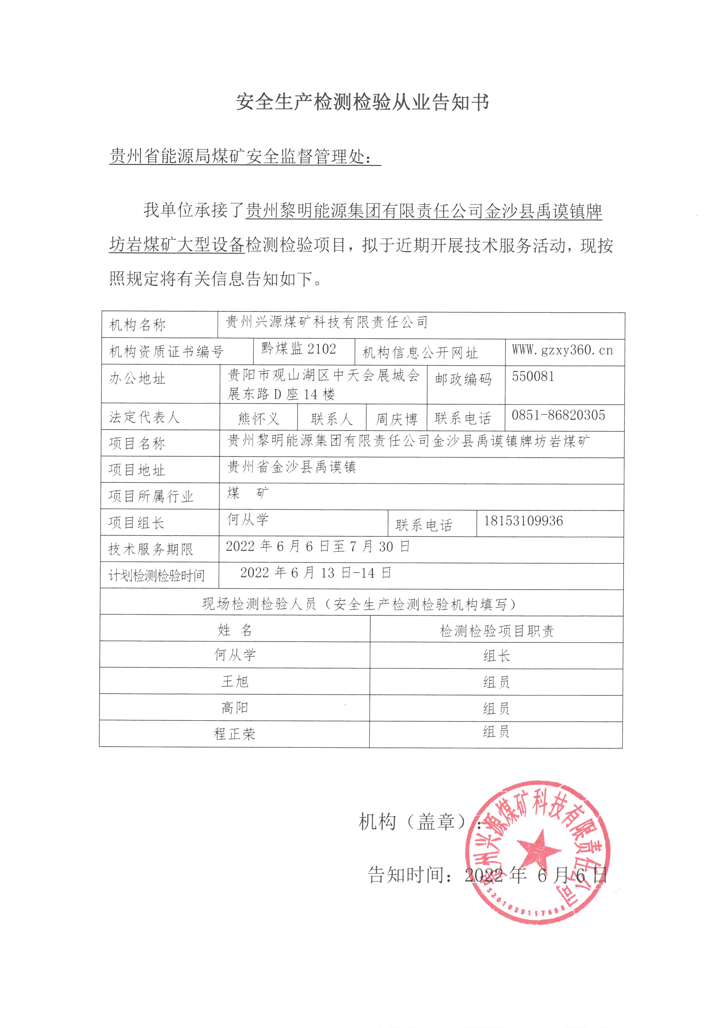 安全生產(chǎn)檢測(cè)檢驗(yàn)從業(yè)告知書(shū)【貴州黎明能源集團(tuán)有限責(zé)任公司金沙縣禹謨鎮(zhèn)牌坊巖煤礦】