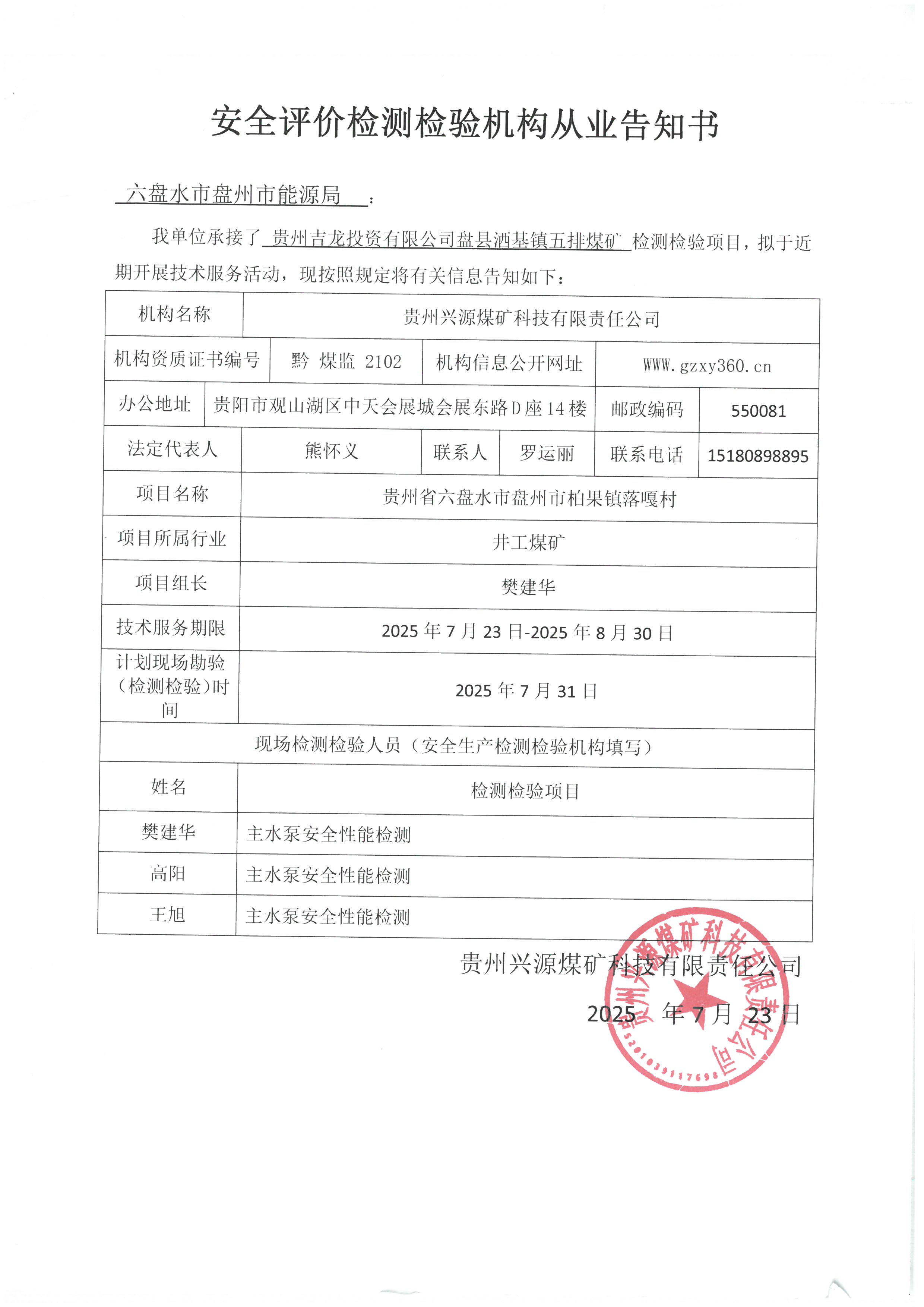 安全評(píng)價(jià)檢測(cè)檢驗(yàn)機(jī)構(gòu)從業(yè)告知書(shū)[貴州吉龍投資有限公司盤(pán)縣灑基鎮(zhèn)五排煤礦]