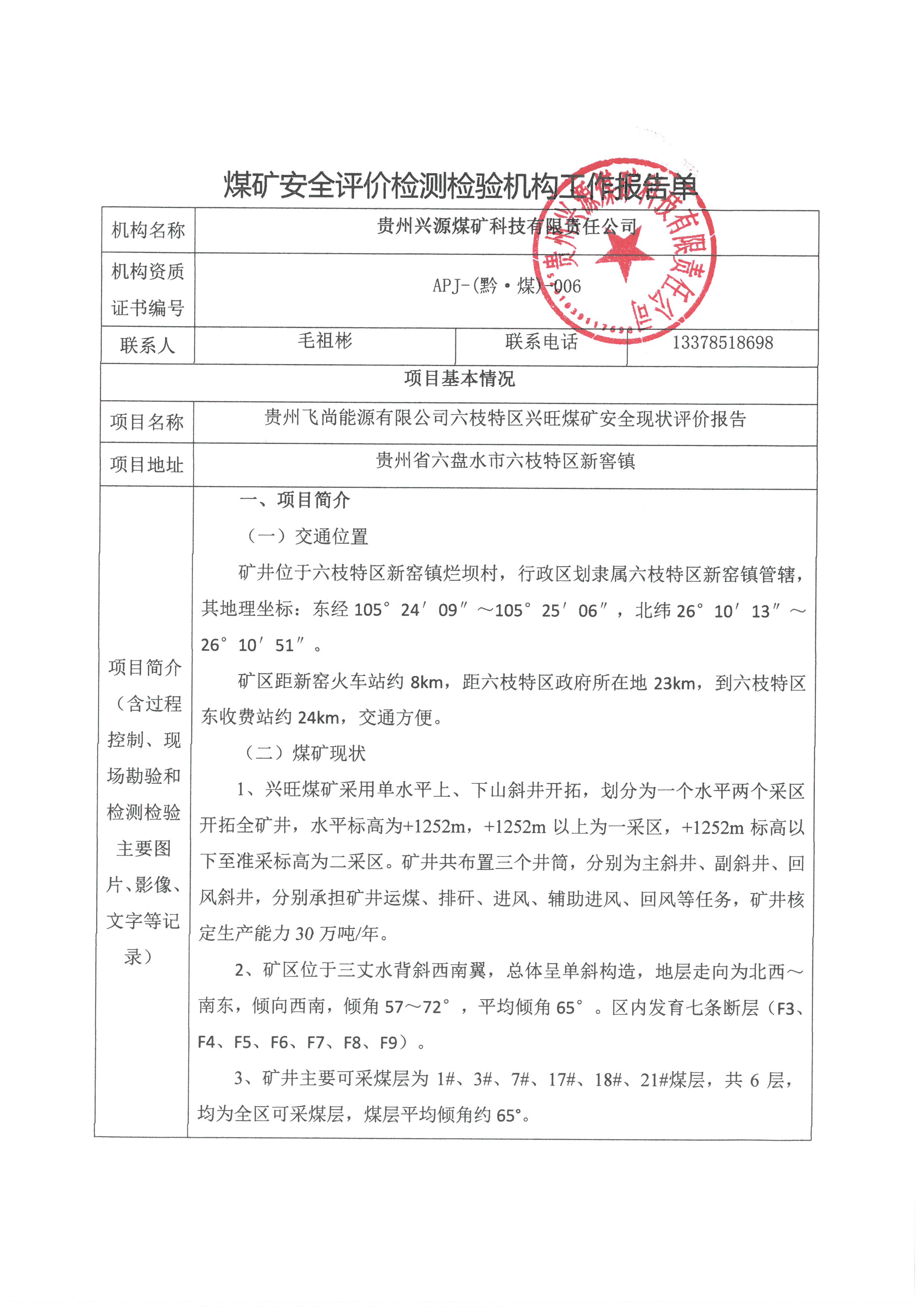 煤礦安全評價檢測檢驗機構工作報告單【貴州飛尚能源有限公司六枝特區興旺煤礦安全現狀評價報告】