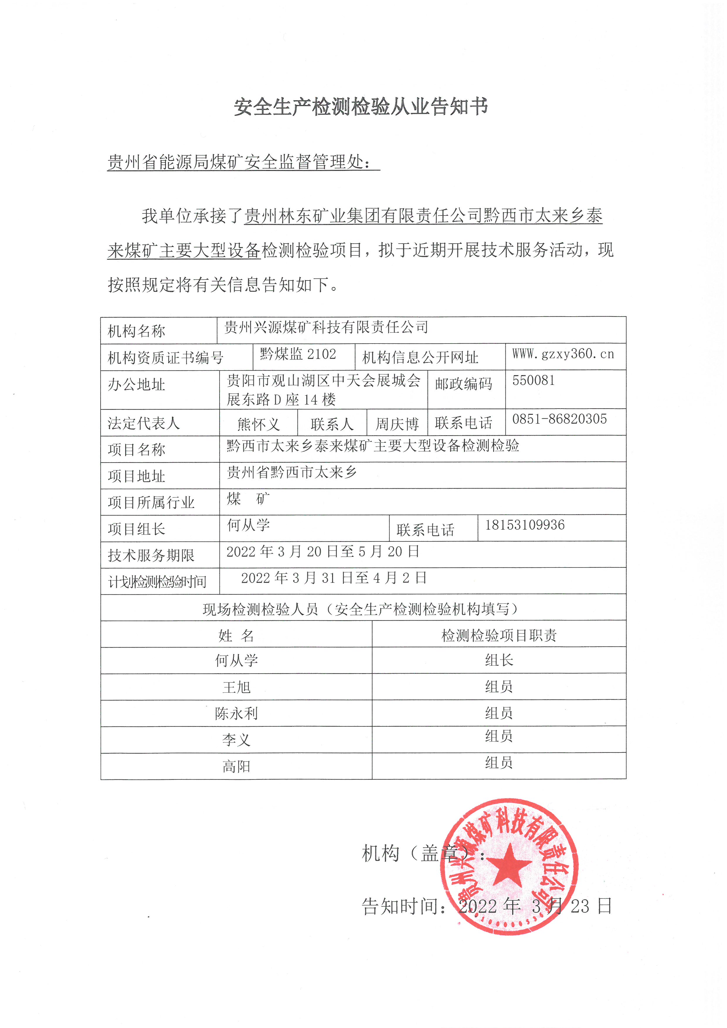 安全生產檢測檢驗從業告知書【貴州林東礦業集團有限責任公司黔西市太來鄉泰來煤礦】