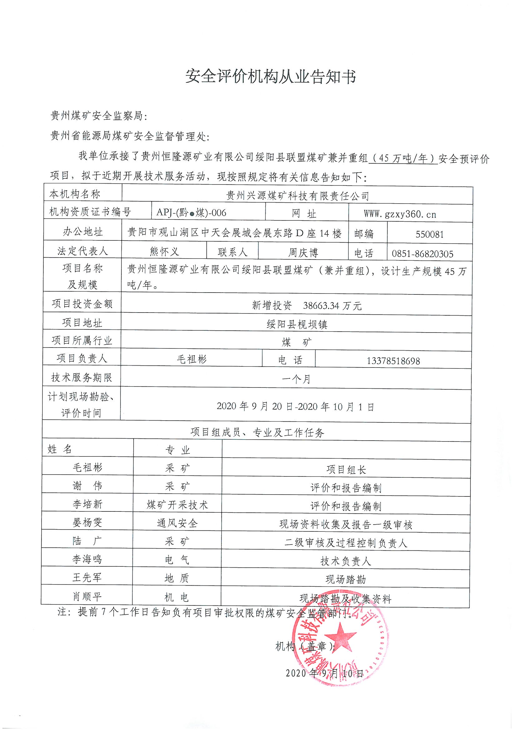安全評價機構從業告知書【貴州恒隆源礦業有限公司綏陽縣聯盟煤礦兼并重組】