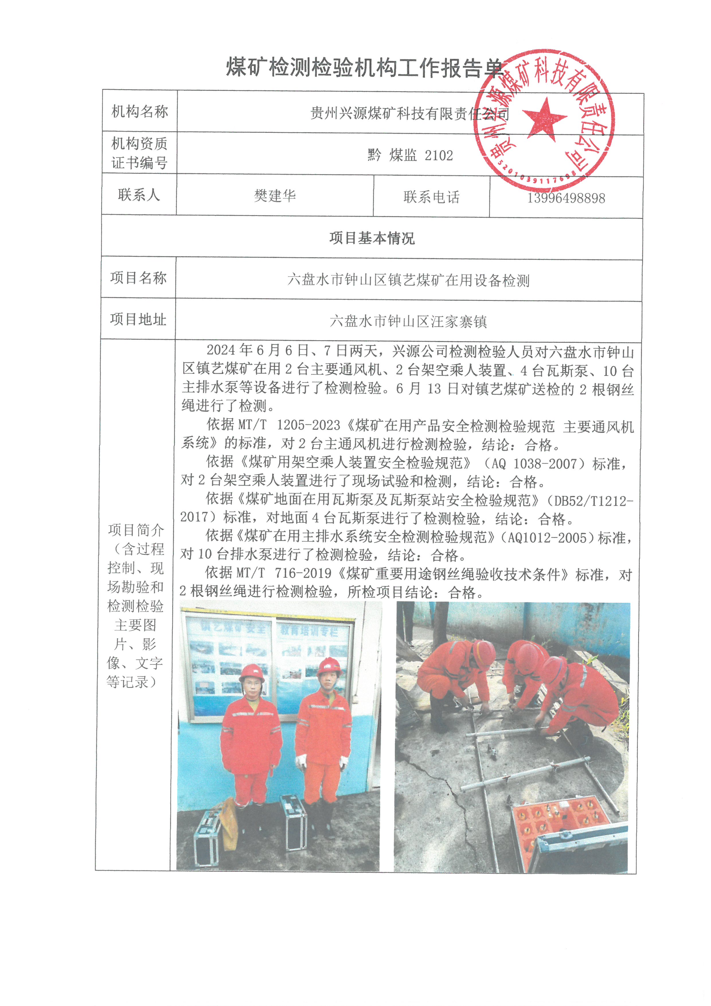 煤礦檢測檢驗機構工作報告單【六盤水市鐘山區鎮藝煤礦在用設備檢測】