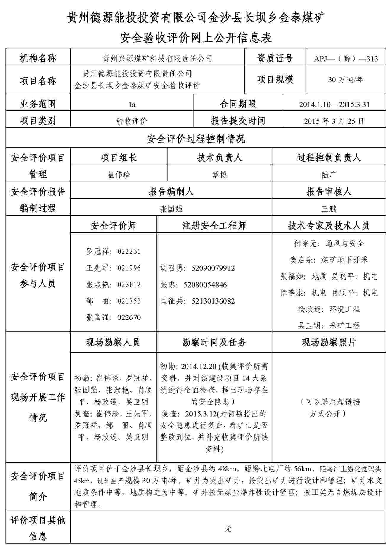 金沙縣長壩鄉金泰煤礦安全評價業務網上公開信息表