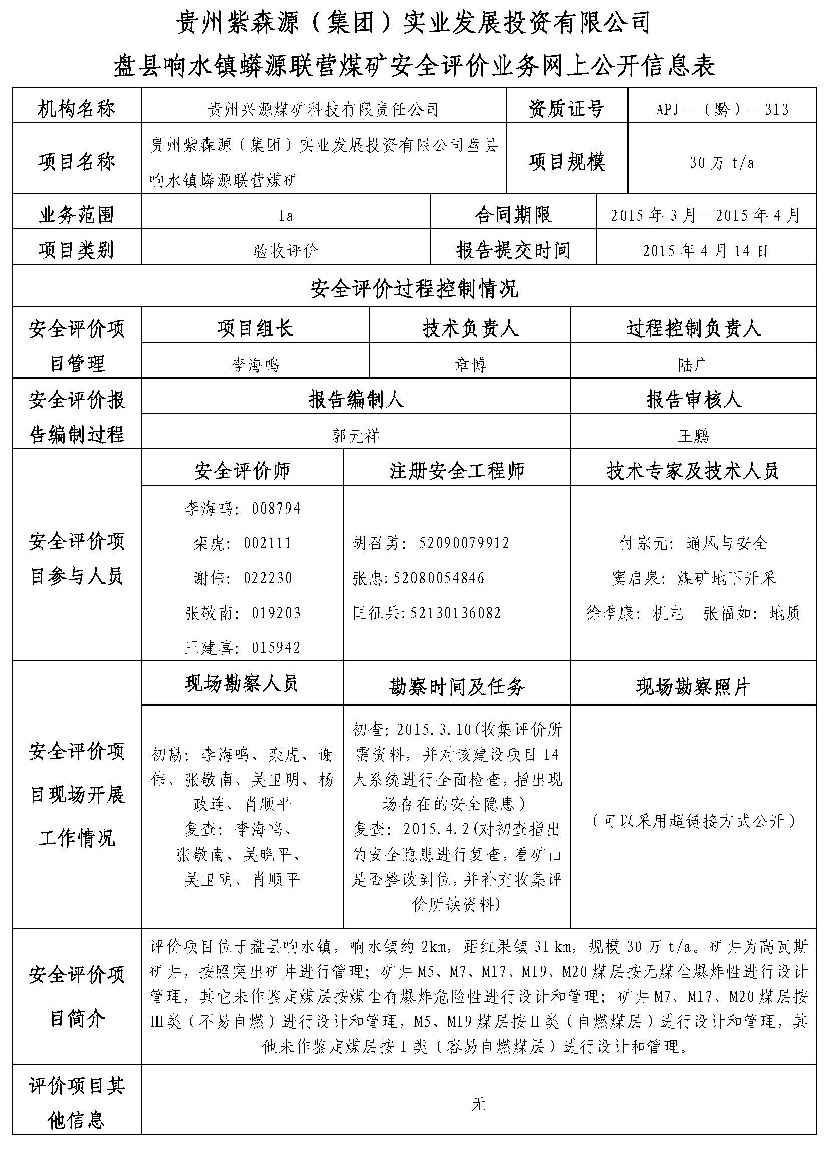 貴州紫森源(集團(tuán))實業(yè)發(fā)展投資有限公司盤縣響水鎮(zhèn)蟒源聯(lián)營煤礦安全評價業(yè)務(wù)網(wǎng)上公開信息表