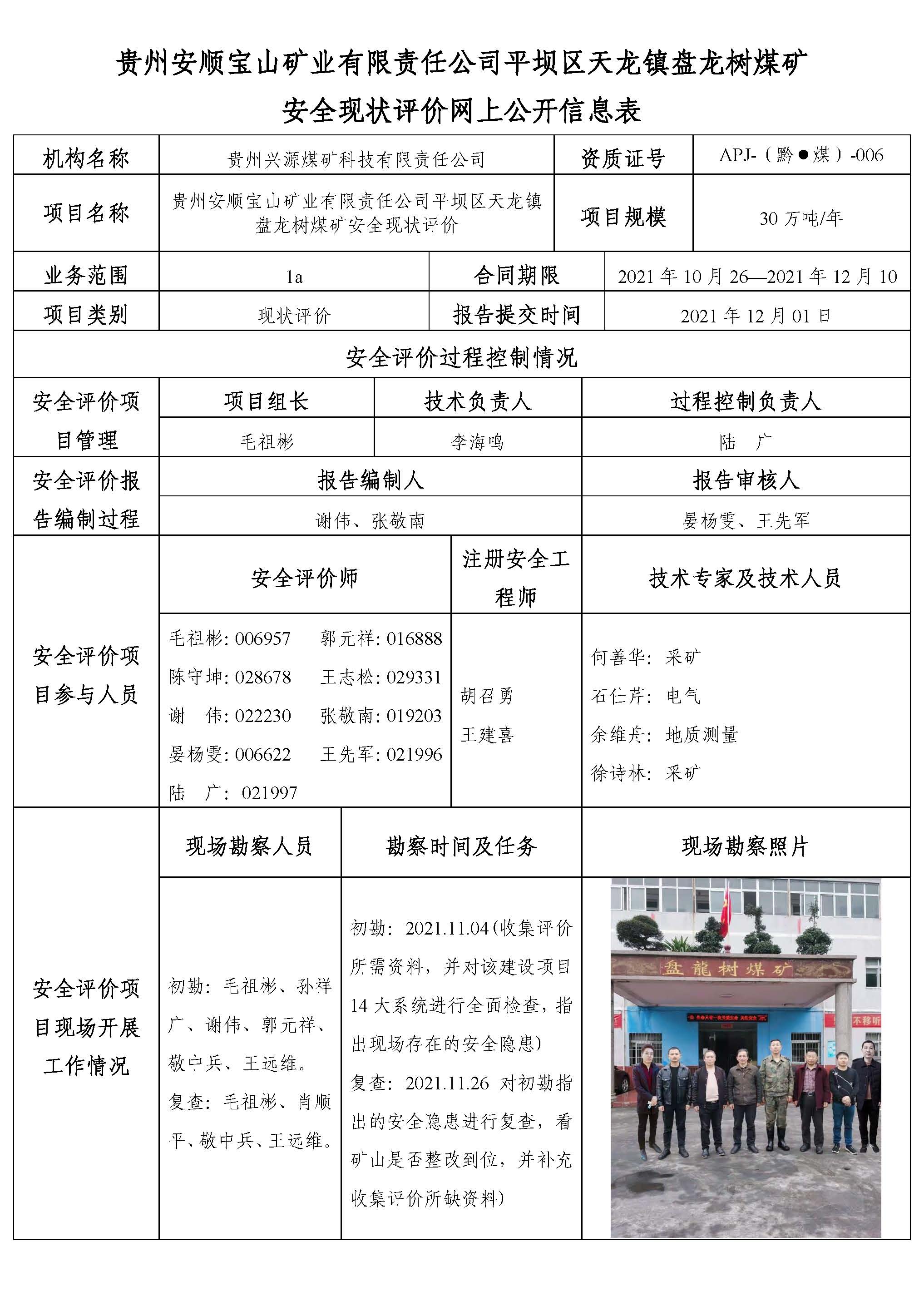 貴州安順寶山礦業有限責任公司平壩區天龍鎮盤龍樹煤礦安全現狀評價網上公開信息表