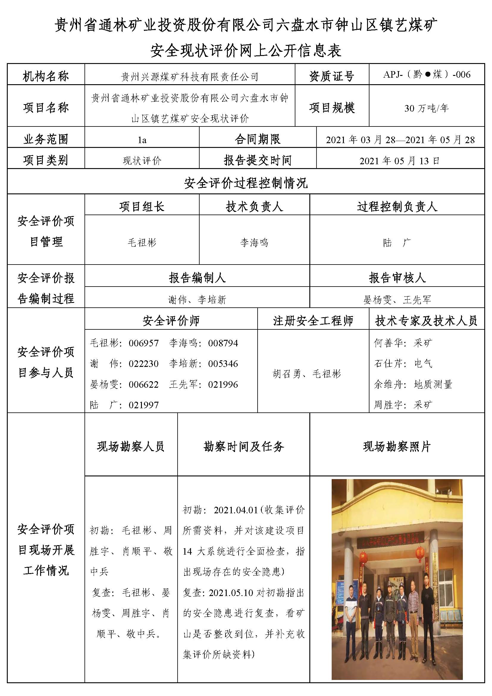 貴州省通林礦業投資股份有限公司六盤水市鐘山區鎮藝煤礦安全現狀評價網上公開信息表