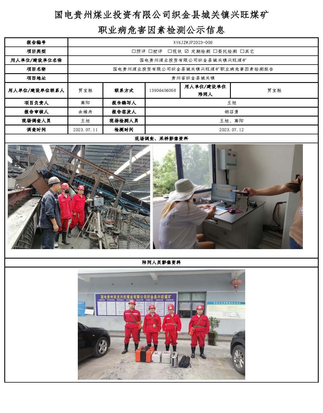 國電貴州煤業投資有限公司織金縣城關鎮興旺煤礦 職業病危害因素檢測公示信息