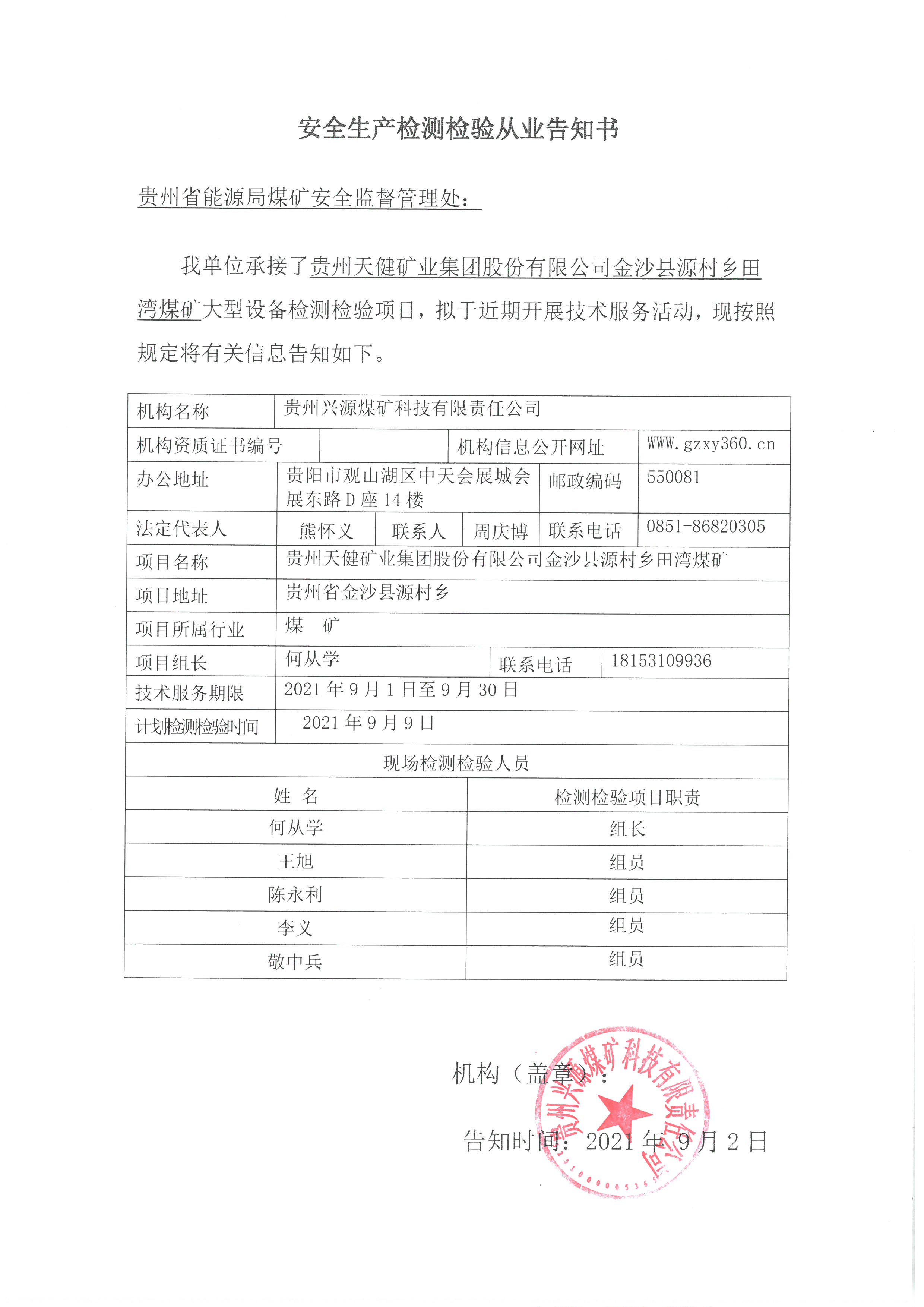 安全生產檢測檢驗從業告知書【貴州天健礦業集團股份有限公司金沙縣源村鄉田灣煤礦】