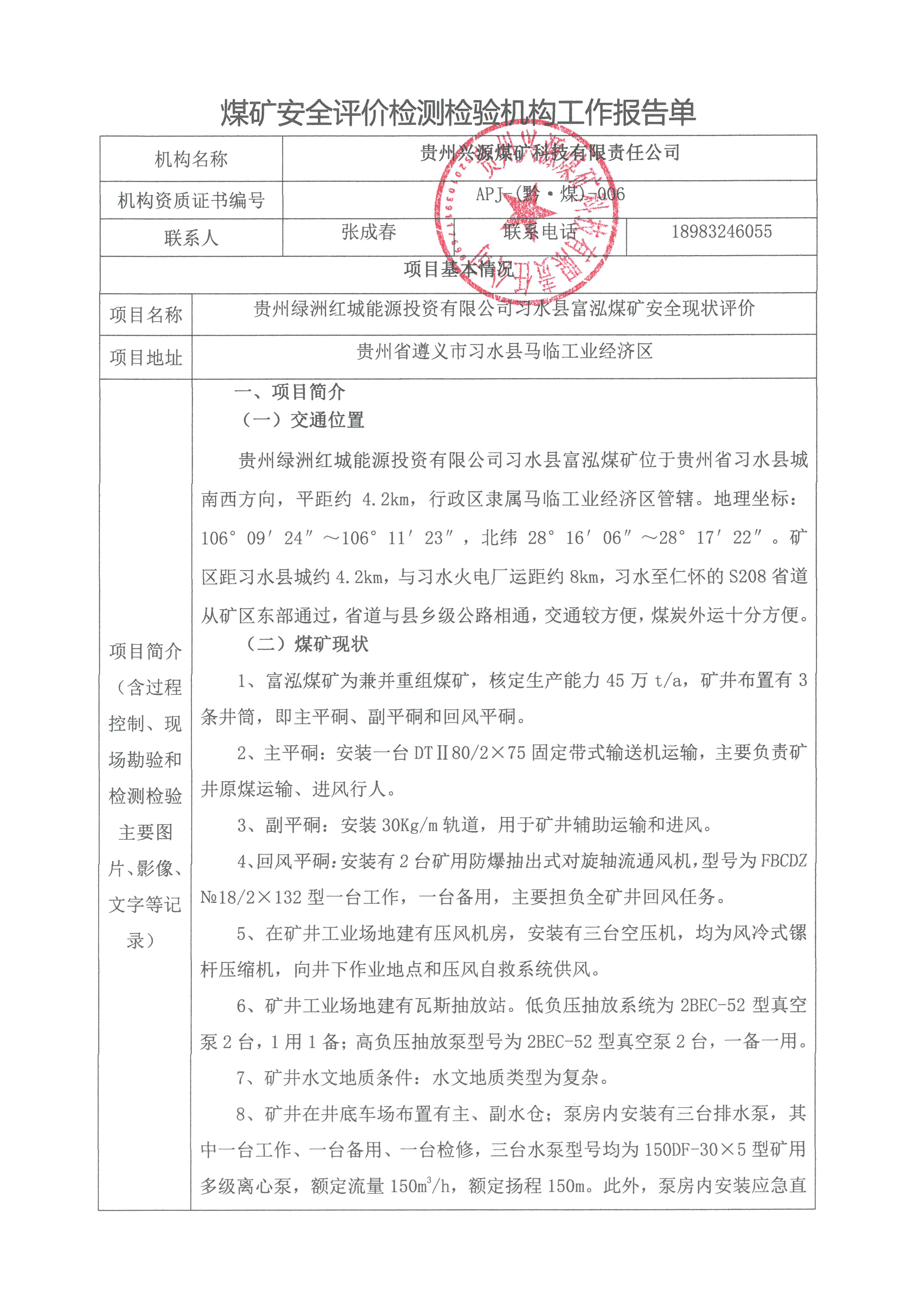 煤礦安全評價檢測檢驗機構工作報告單【貴州綠洲紅城能源投資有限公司習水縣富泓煤礦安全現狀評價】