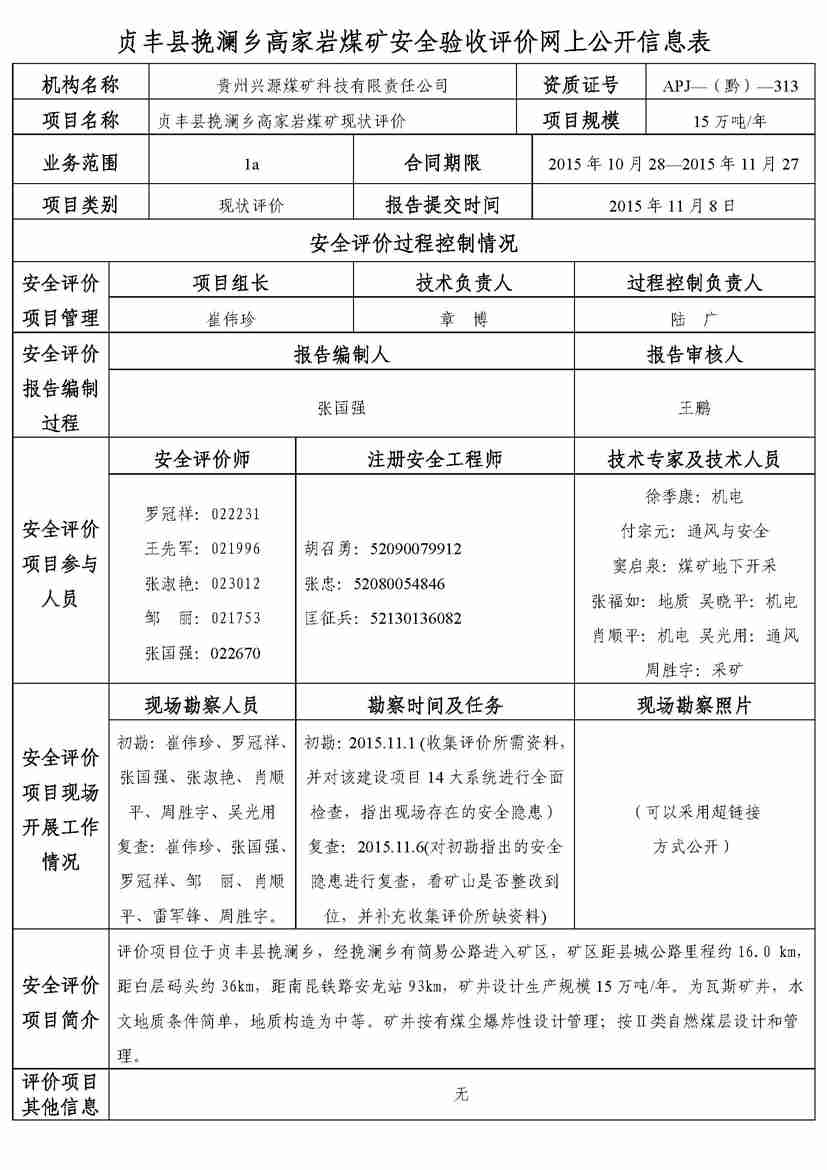 貞豐縣挽瀾鄉高家巖煤礦安全驗收評價網上公開信息表