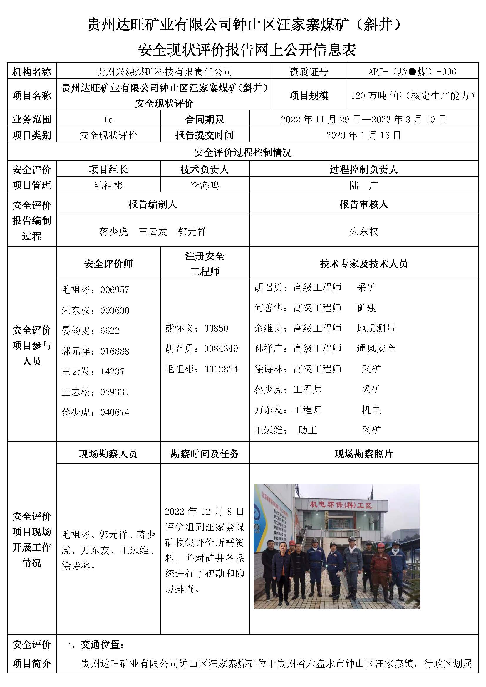 貴州達旺礦業有限公司鐘山區汪家寨煤礦(斜井)安全現狀評價報告網上公開信息表