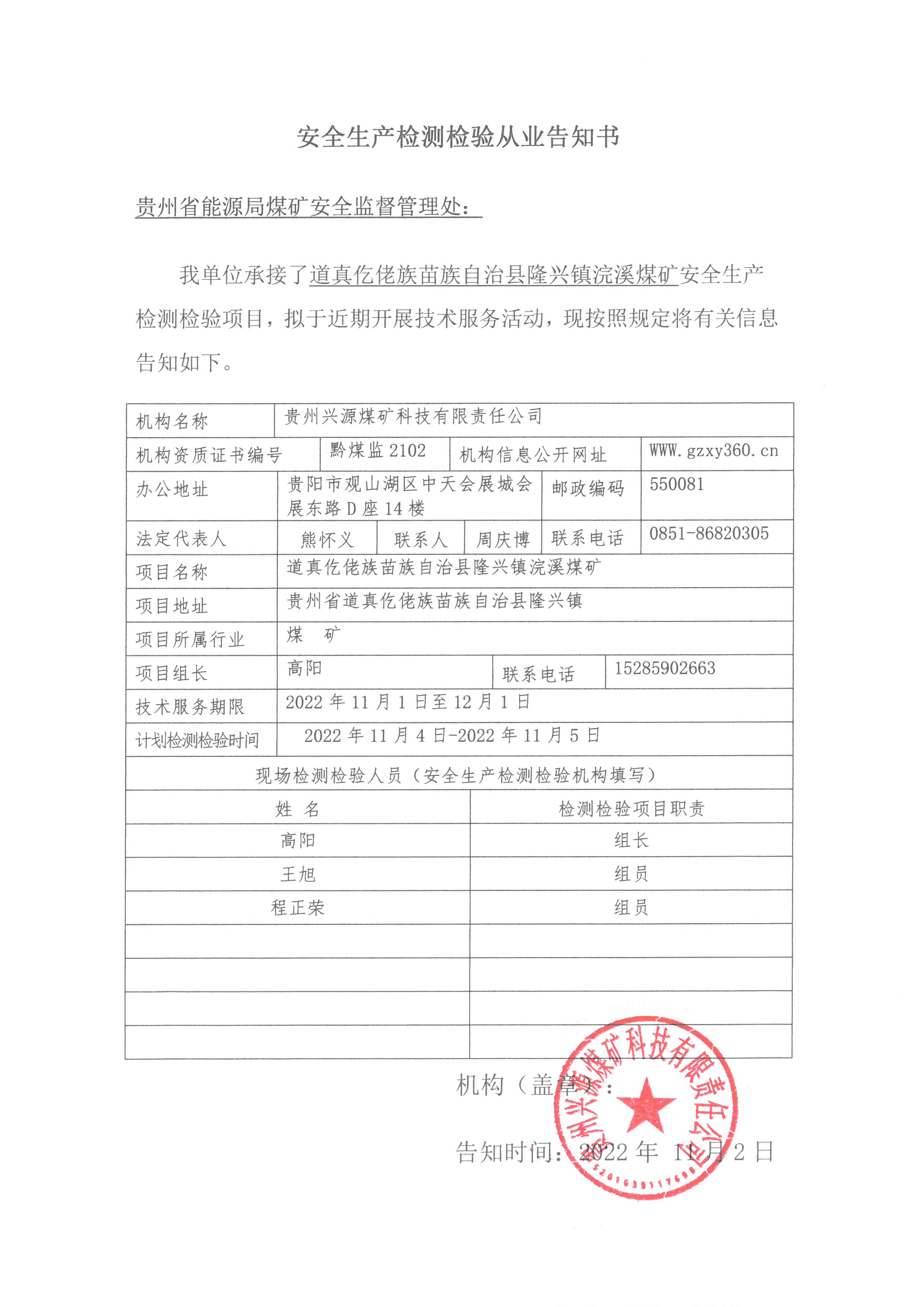 安全生產檢測檢驗從業告知書【道真仡佬族苗族自治縣隆興鎮浣溪煤礦安全生產檢測檢驗項目】
