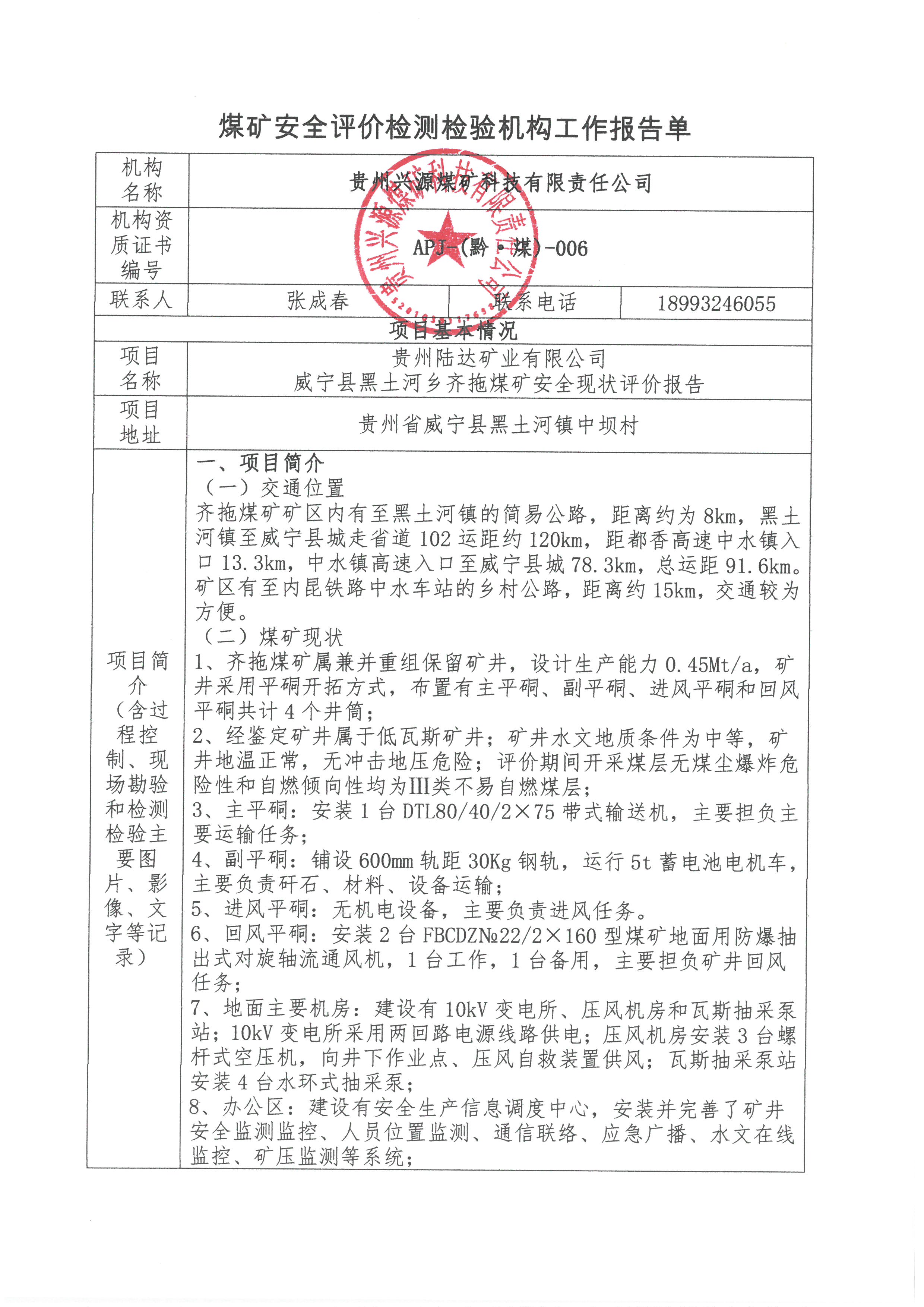 煤礦安全評價檢測檢驗機(jī)構(gòu)工作報告單【貴州陸達(dá)礦業(yè)有限公司威寧縣黑土河鄉(xiāng)齊拖煤礦安全現(xiàn)狀評價報告】