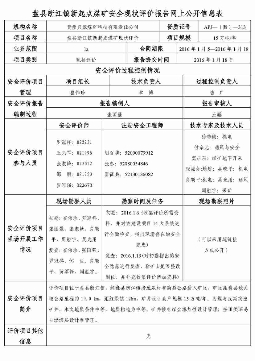 盤縣斷江鎮新起點煤礦安全現狀評價報告網上公開信息表