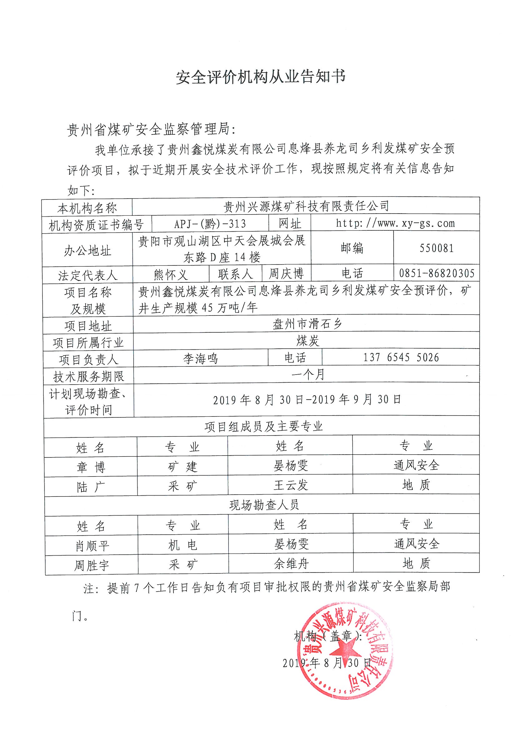 安全評(píng)價(jià)機(jī)構(gòu)從業(yè)告知書【貴州鑫悅煤炭有限公司息烽縣養(yǎng)龍司鄉(xiāng)利發(fā)煤礦】