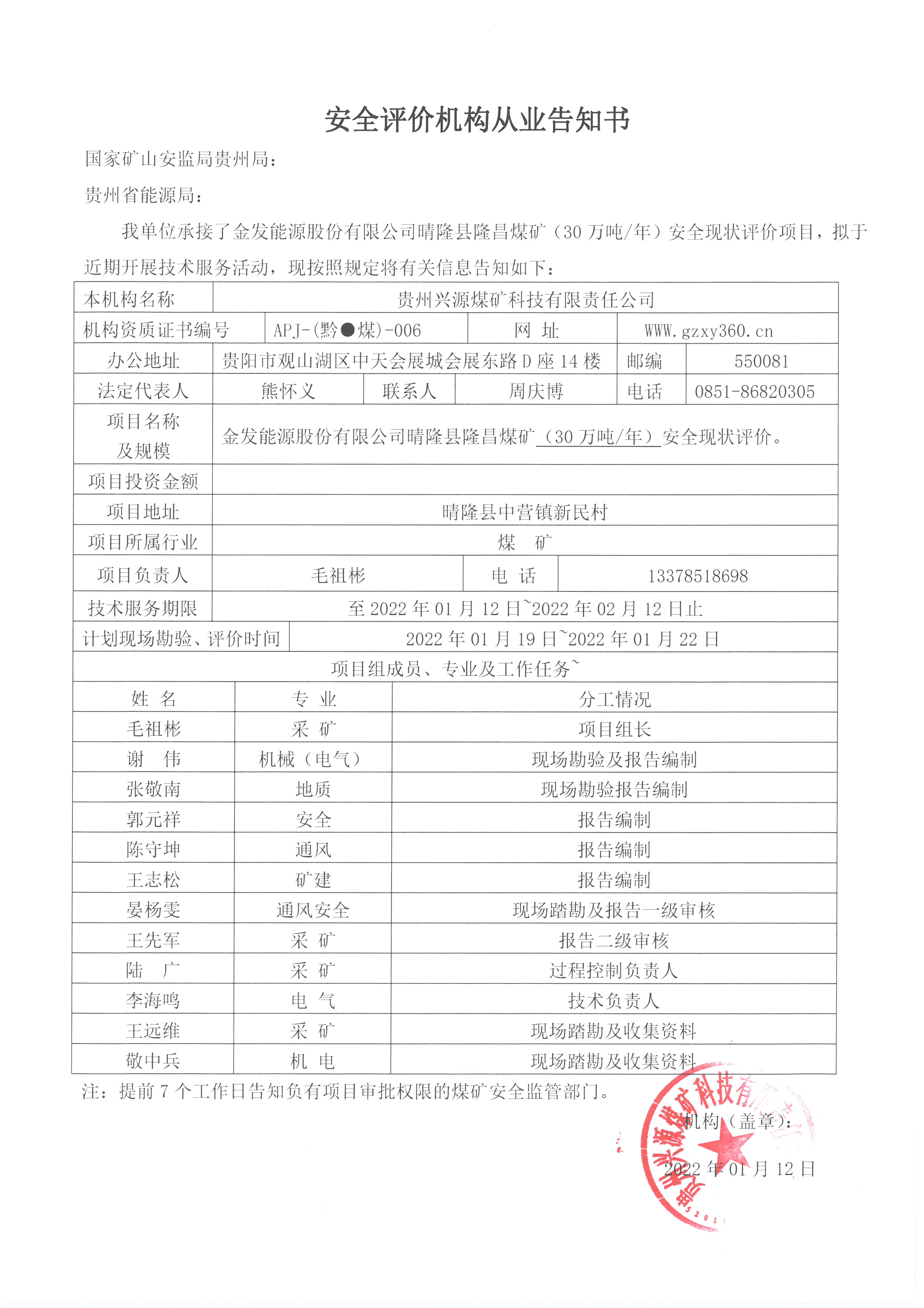 安全評價機構從業告知書(金發能源股份有限公司晴隆縣隆昌煤礦)