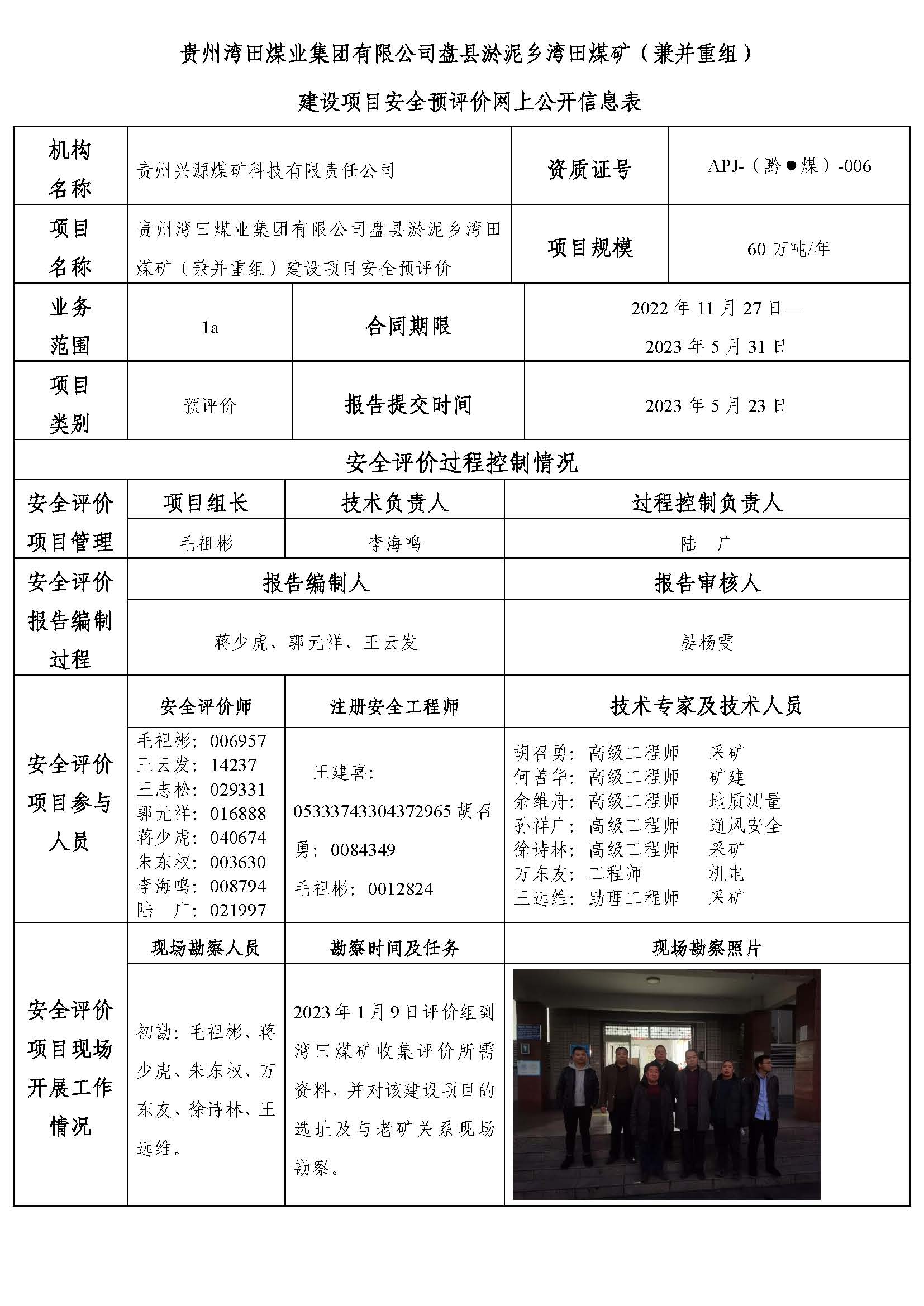 貴州灣田煤業(yè)集團(tuán)有限公司盤縣淤泥鄉(xiāng)灣田煤礦(兼并重組) 建設(shè)項(xiàng)目安全預(yù)評價(jià)網(wǎng)上公開信息表