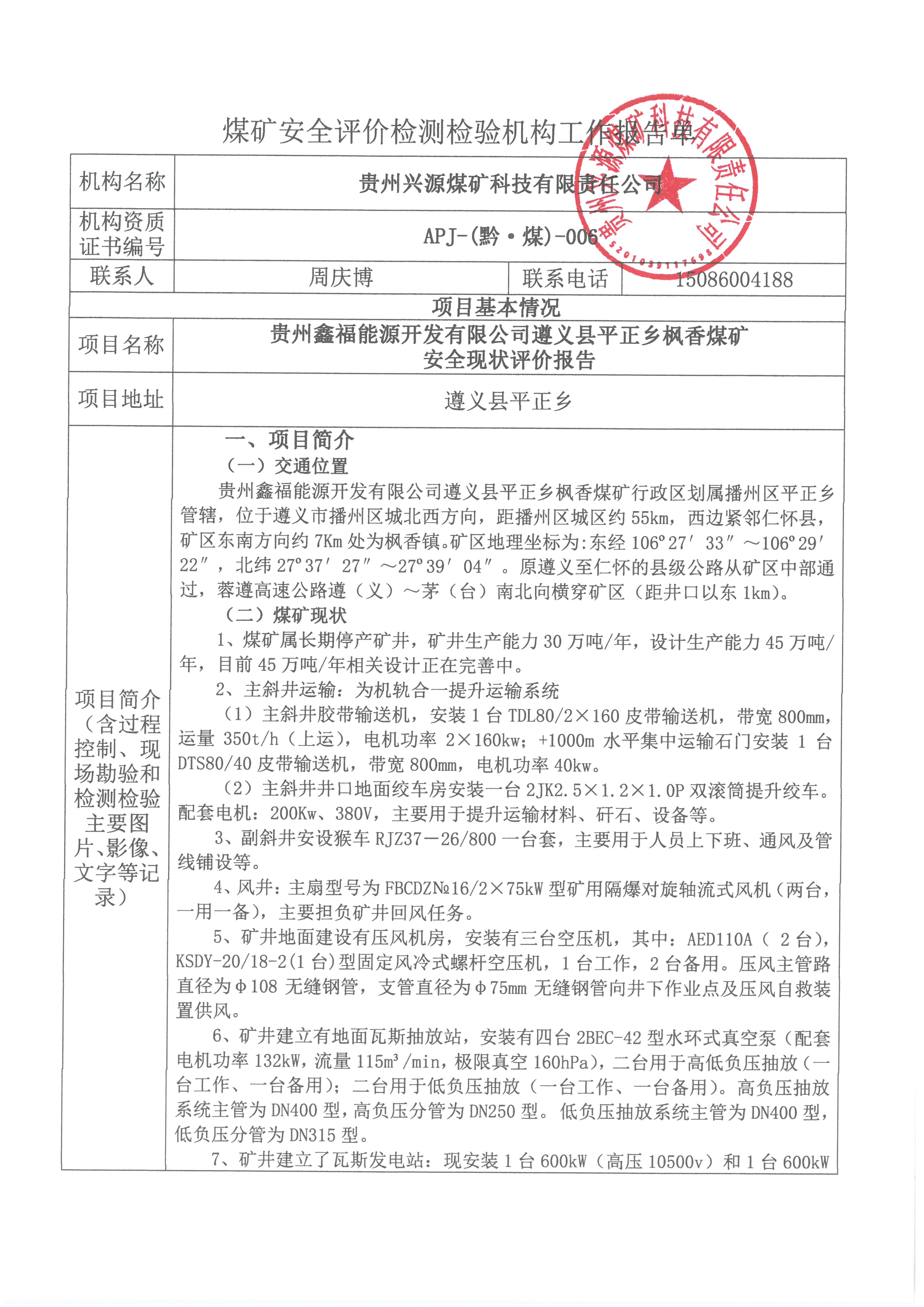 煤礦安全評價(jià)檢測檢驗(yàn)機(jī)構(gòu)工作報(bào)告單【貴州鑫福能源開發(fā)有限公司遵義縣平正鄉(xiāng)楓香煤礦】安全現(xiàn)狀評價(jià)報(bào)告