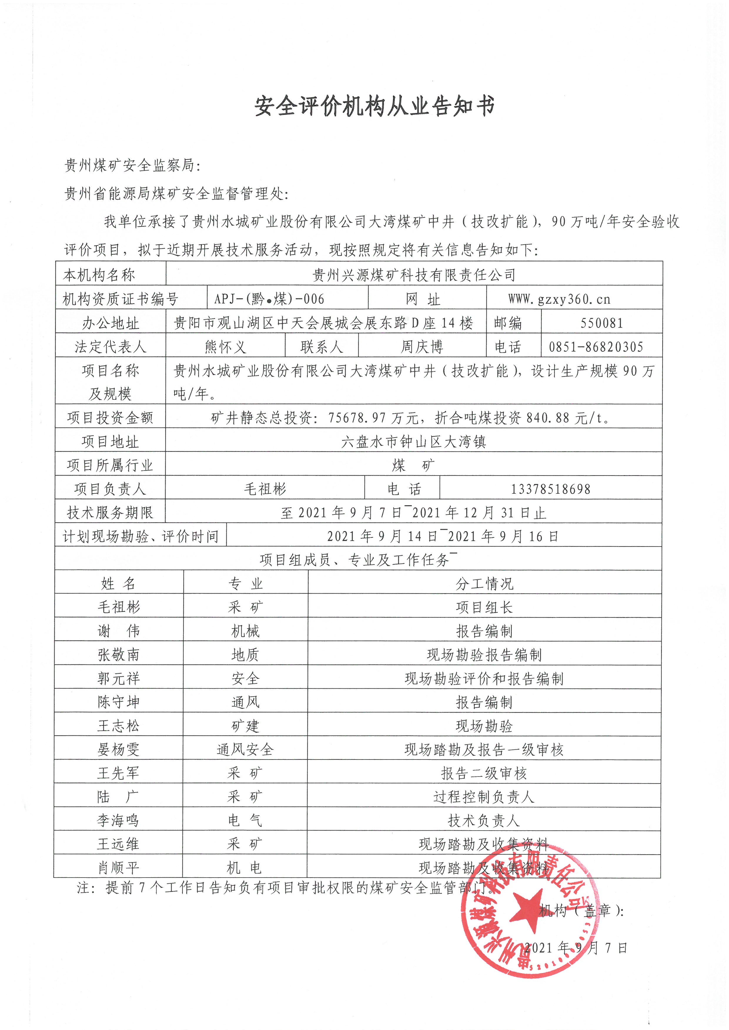 安全評價機構(gòu)從業(yè)告知書(貴州水城礦業(yè)股份有限公司大灣煤礦中井(技改擴能)90萬噸年安全驗收評價)